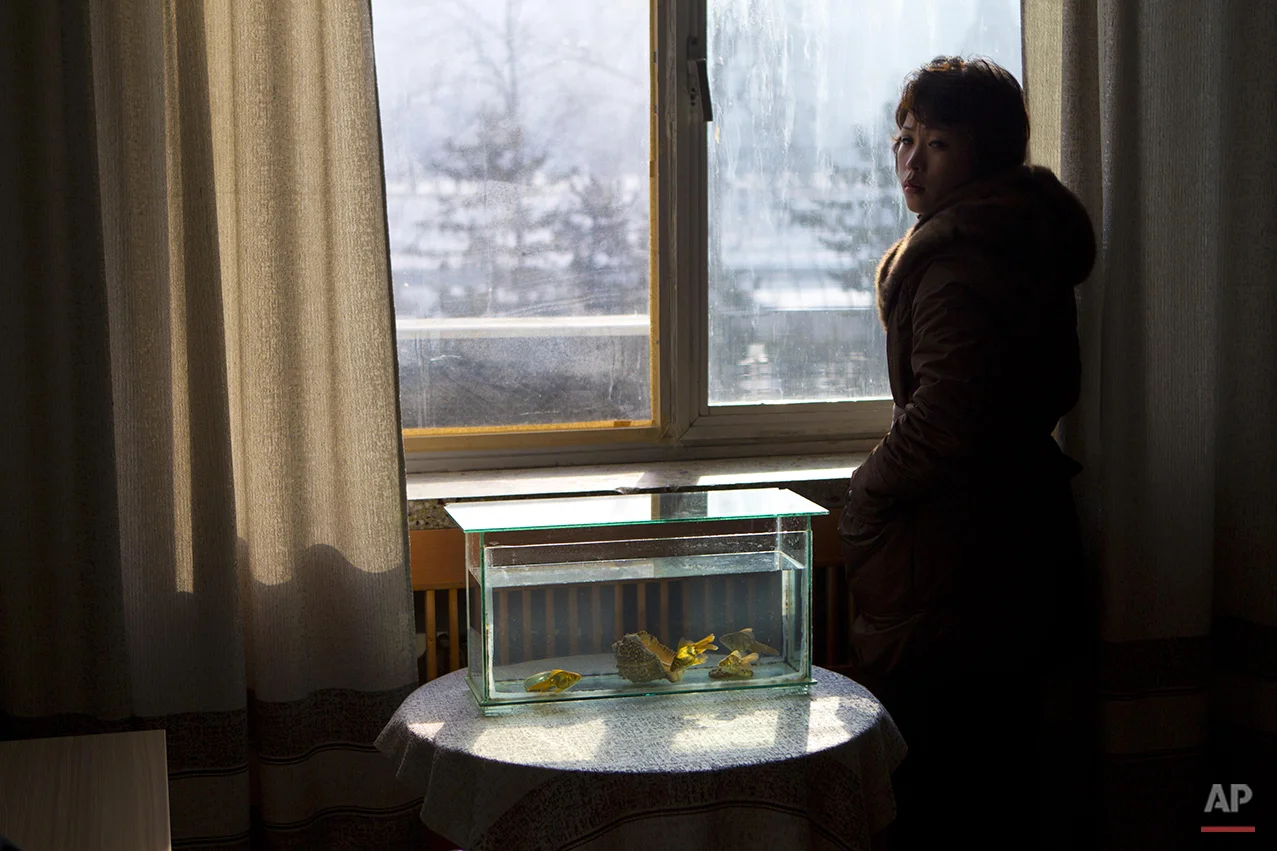 Lead Image Caption: In this Friday, June 21, 2013 photo, a woman arranges flowers in front of a painting depicting the late leaders Kim Il Sung, left, and Kim Jong Il at the lobby of a hotel in Haeju city, South Hwanghae Province, North Korea. (AP Photo/Alexander F. Yuan)