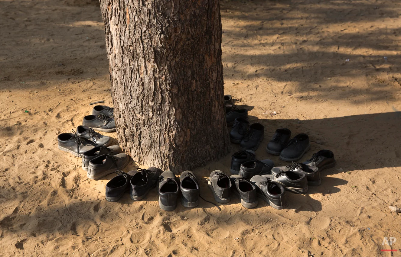 Students keep their shoes around a tree as they take deworming pills in their school in Neemrana, 123 kilometers (76.8 miles) from New Delhi, in the Indian state of Rajasthan, Wednesday, Feb. 10, 2016. Millions of Indian children are taking part in a massive national deworming campaign to prevent parasitic worms from infecting their bodies and impairing their mental and physical development. The campaign is targeting 270 million children across the country with a second treatment planned next week for those left out on Wednesday, Indiaís Health Ministry said in a statement. (AP Photo/Manish Swarup)