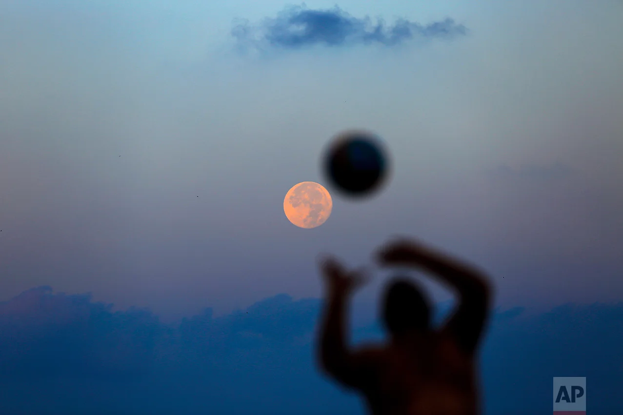 The moon sets behind a Lebanese man playing beach volleyball with his friends on the seafront promenade in Beirut, Lebanon, Tuesday, Nov. 15, 2016. The brightest moon in almost 69 years lit up the sky, during its closest approach to earth as the "Supermoon" reached its most luminescent phase. The moon won't be this close again until Nov. 25, 2035. (AP Photo/Hassan Ammar)