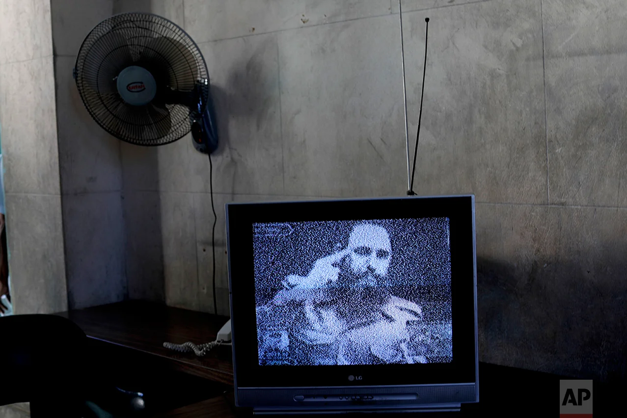 A television showing black and white footage of Fidel Castro delivering a speech sits on a table at a memorial in his honor in Guanabacoa on the outskirts in Havana, Cuba, Tuesday, Nov. 29, 2016. Schools and government offices are closed Tuesday for a second day of homage to Castro, with the day ending in a rally on the plaza where the Cuban leader delivered fiery speeches to crowds in the years after he seized power. (AP Photo/Natacha Pisarenko)
