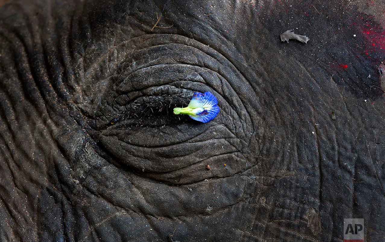 A flower petal is placed on the eye of a wild Asiatic male elephant at Amgaon, near Gauhati, the capital of the northeastern Indian state of Assam, Saturday, Dec. 3, 2016. According to forest officer R.K. Das, the elephant died after it was electrocuted by a high tension electric wire when it was searching for food on the border of Amchang wildlife sanctuary on Friday night. (AP Photo/Anupam Nath)