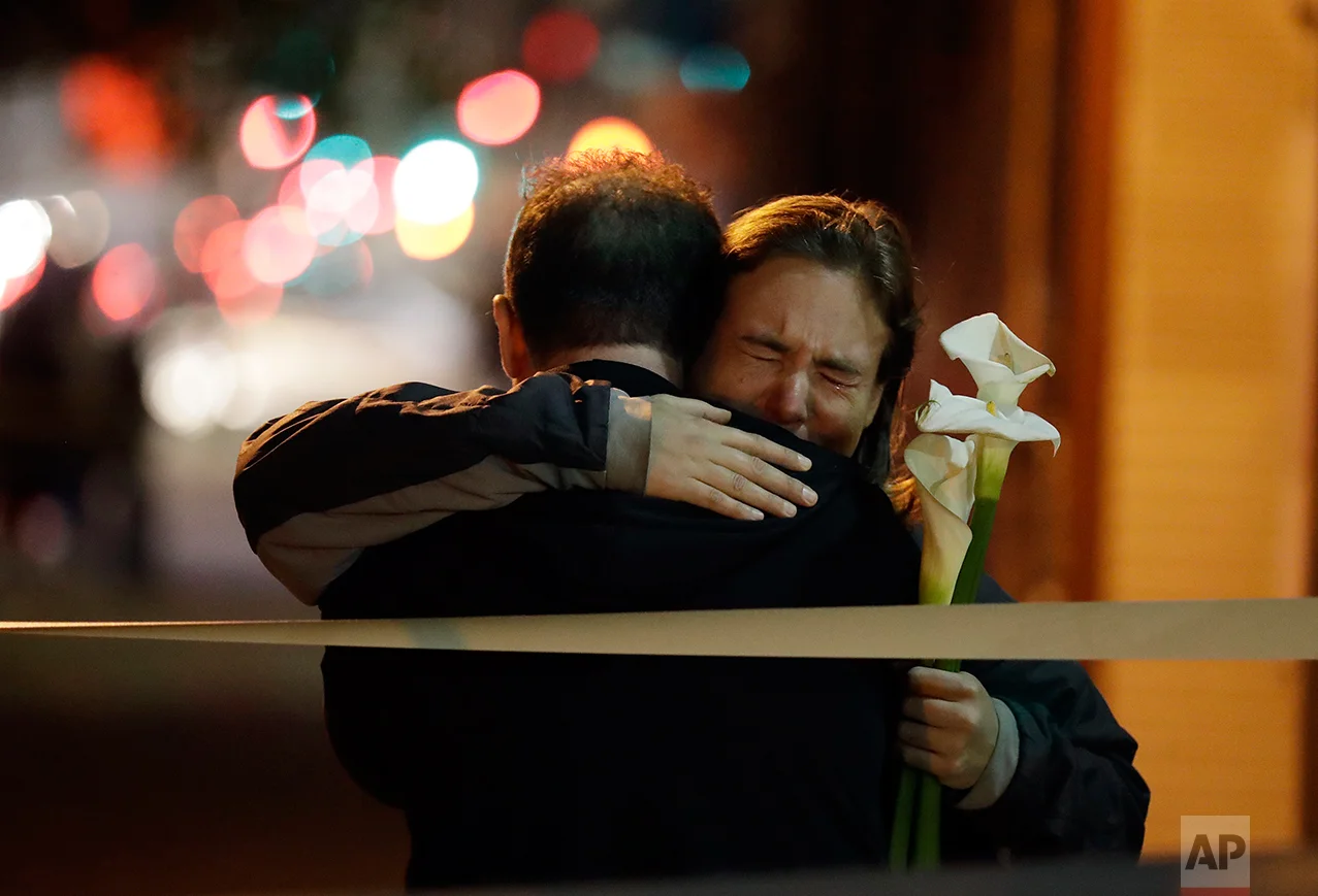 Mourners embrace near the site of a warehouse fire Sunday, Dec. 4, 2016, in Oakland, Calif. The death toll from a fire that tore through a warehouse hosting a late-night dance party climbed on Sunday as firefighters painstakingly combed through rubble for others believed to still be missing. (AP Photo/Marcio Jose Sanchez)