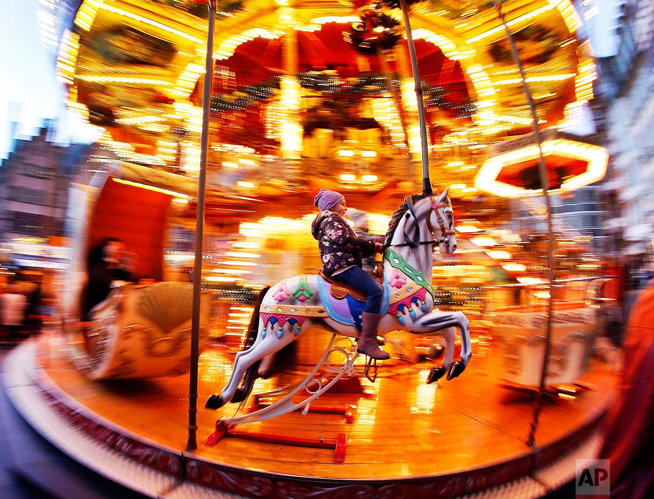A girl rides a horse on a merry-go-round at the Christmas market in Frankfurt, Germany, Monday, Nov. 28, 2016. (AP Photo/Michael Probst)