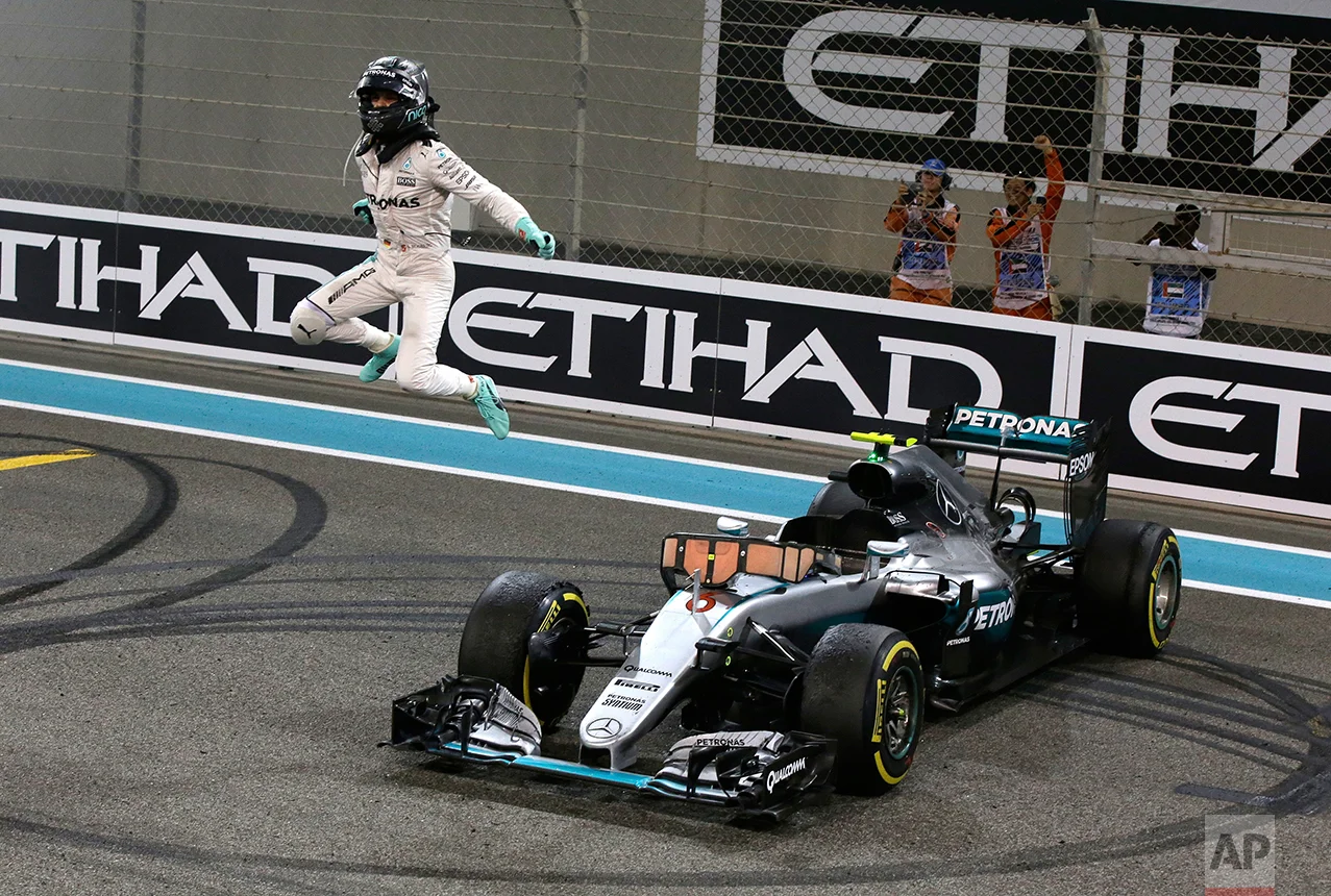 Mercedes driver Nico Rosberg of Germany celebrates after finishing second to win the 2016 world championship during the Emirates Formula One Grand Prix at the Yas Marina racetrack in Abu Dhabi, United Arab Emirates, on Nov. 27, 2016. (AP Photo/Luca Bruno)