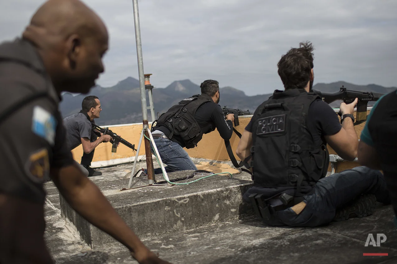 In this July 7, 2016 photo, police exchange gunfire with drug traffickers at the "pacified" Alemao slum complex in Rio de Janeiro, Brazil. Half a dozen officers had entrenched themselves behind a cable car station while they shot it out with suspected drug traffickers in the sprawling cluster of slums in north Rio. Shootouts erupt daily, even in slums where community policing programs had successfully rewritten the narrative in recent years. (AP Photo/Felipe Dana)