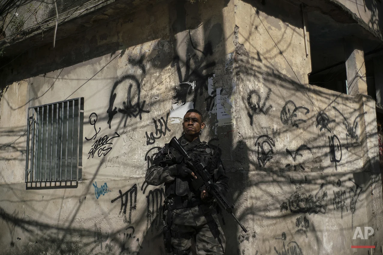 In this June 29, 2016 photo, a police officer takes position during an operation against drug traffickers at the "pacified" Jacarezinho slum in Rio de Janeiro, Brazil. The number of people killed by police has spiked in the past two years after dropping significantly the previous six. Overall murders are also on the rise in the first half of 2016, just as officials wanted to use the Aug. 5-21 Olympic Games to showcase the city as a tourist destination. (AP Photo/Felipe Dana)