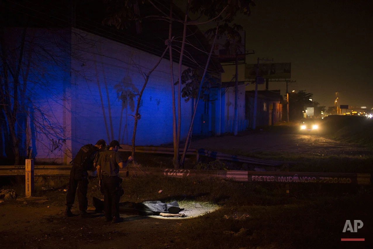 In this July 15, 2016 photo, police officers use a flashlight to inspect the crime scene where the body of an alleged thief was found on a roadside in Nova Iguacu, greater Rio de Janeiro, Brazil. Gruesome scenes of death and impunity play out daily in Rio's hundreds of shantytowns, known as favelas. (AP Photo/Felipe Dana)
