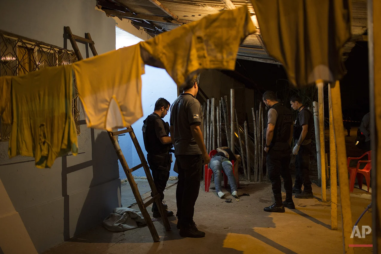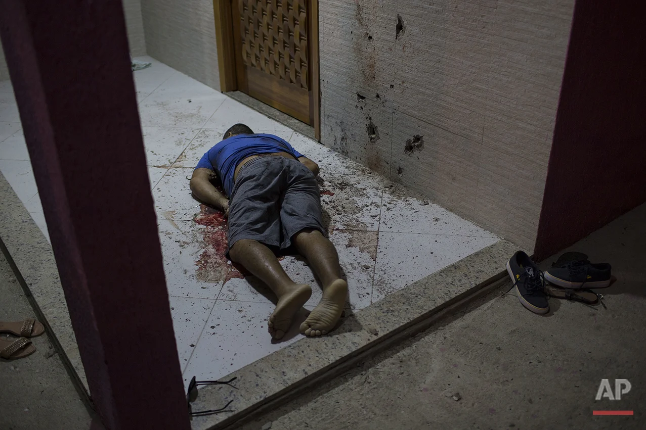 This July 13, 2016 photo shows the body of a man who was taken from the inside of his home and shot dead at the entrance of his home in Nova Iguacu, greater Rio de Janeiro, Brazil. Scenes of impunity and violence play out daily in many of Rio's hundreds of slums, known here as favelas, and other outlying areas. Police believe this homicide was gang-related. (AP Photo/Felipe Dana)