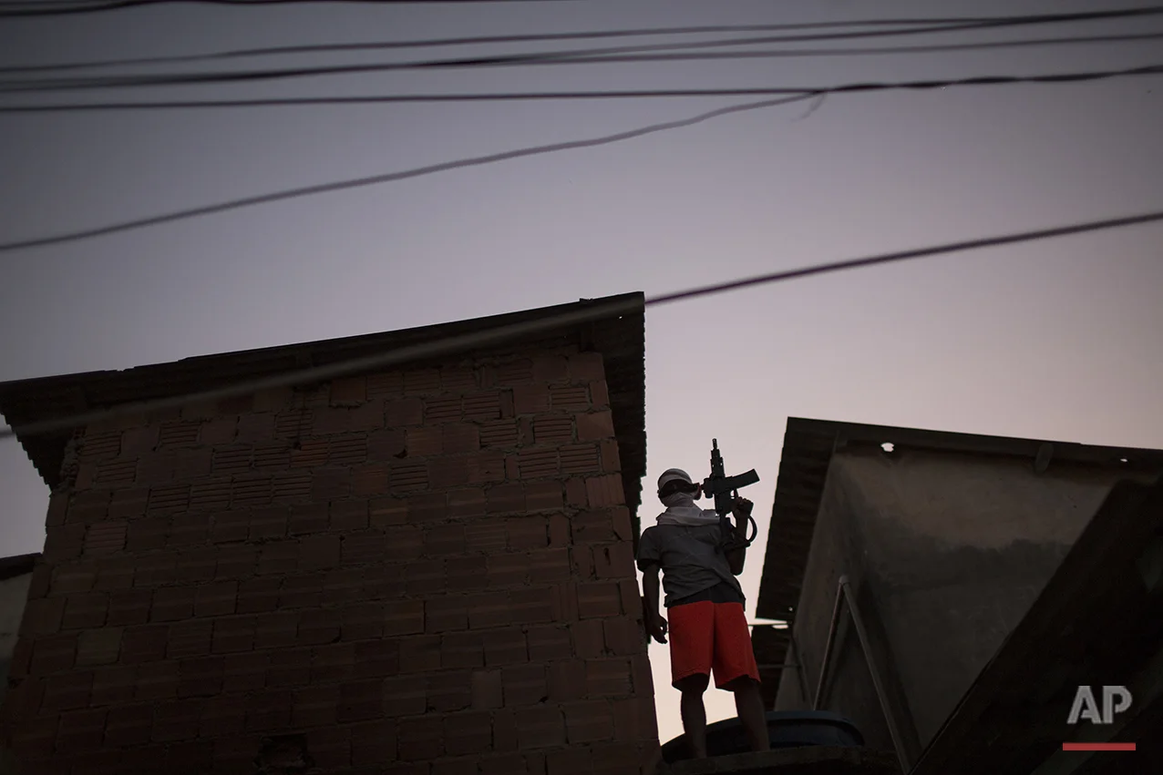 In this July 11, 2016 photo, a young drug trafficker poses for a photo holding his weapon at a slum in Rio de Janeiro, Brazil. Teenagers openly tote guns while they work as guards, lookouts and distributors for drug lords operating just a few miles (kilometers) from where hundreds of thousands and tourists and athletes will be for the Aug. 5-21 Olympic Games. (AP Photo/Felipe Dana)