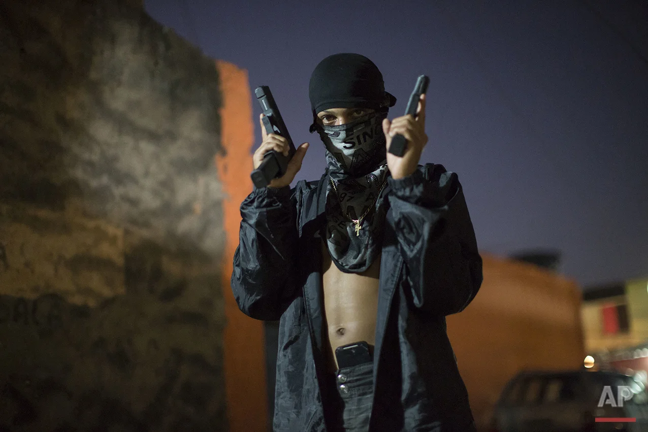 In this July 11, 2016 photo, a young, masked drug trafficker poses for photos holding his guns at a slum in Rio de Janeiro, Brazil. Teenagers openly tote guns while they work as guards, lookouts and distributors for drug lords operating just a few miles (kilometers) from where hundreds of thousands and tourists and athletes will be for the Aug. 5-21 Olympic Games. (AP Photo/Felipe Dana)