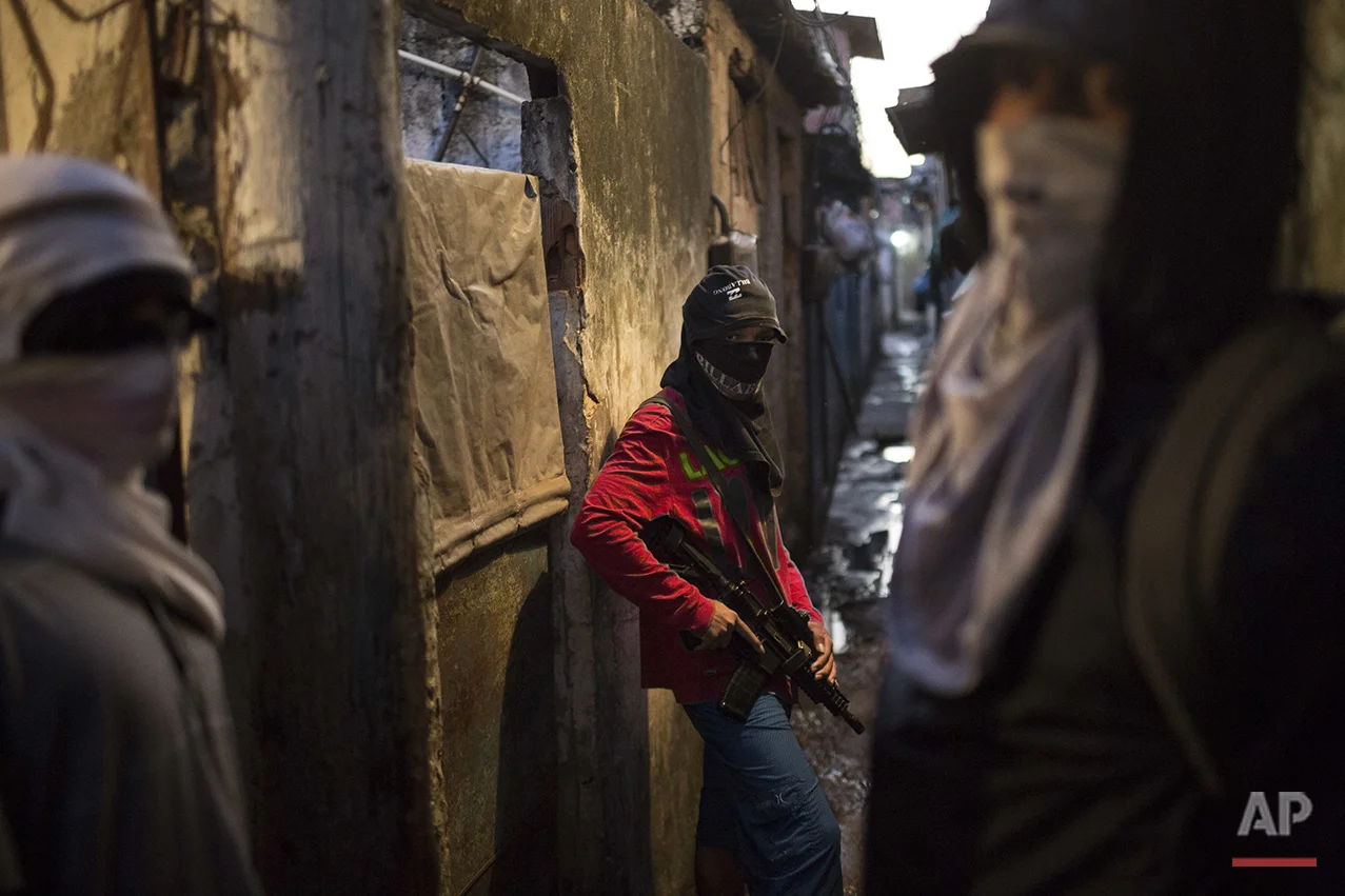 In this July 11, 2016 photo, masked teenage boys pose for photos holding their guns at a slum in Rio de Janeiro, Brazil. The teens are security guards, lookouts and distributors for drug lords operating just a few miles (kilometers) from where hundreds of thousands and tourists and athletes will be for the Aug. 5-21 Olympic Games. (AP Photo/Felipe Dana)