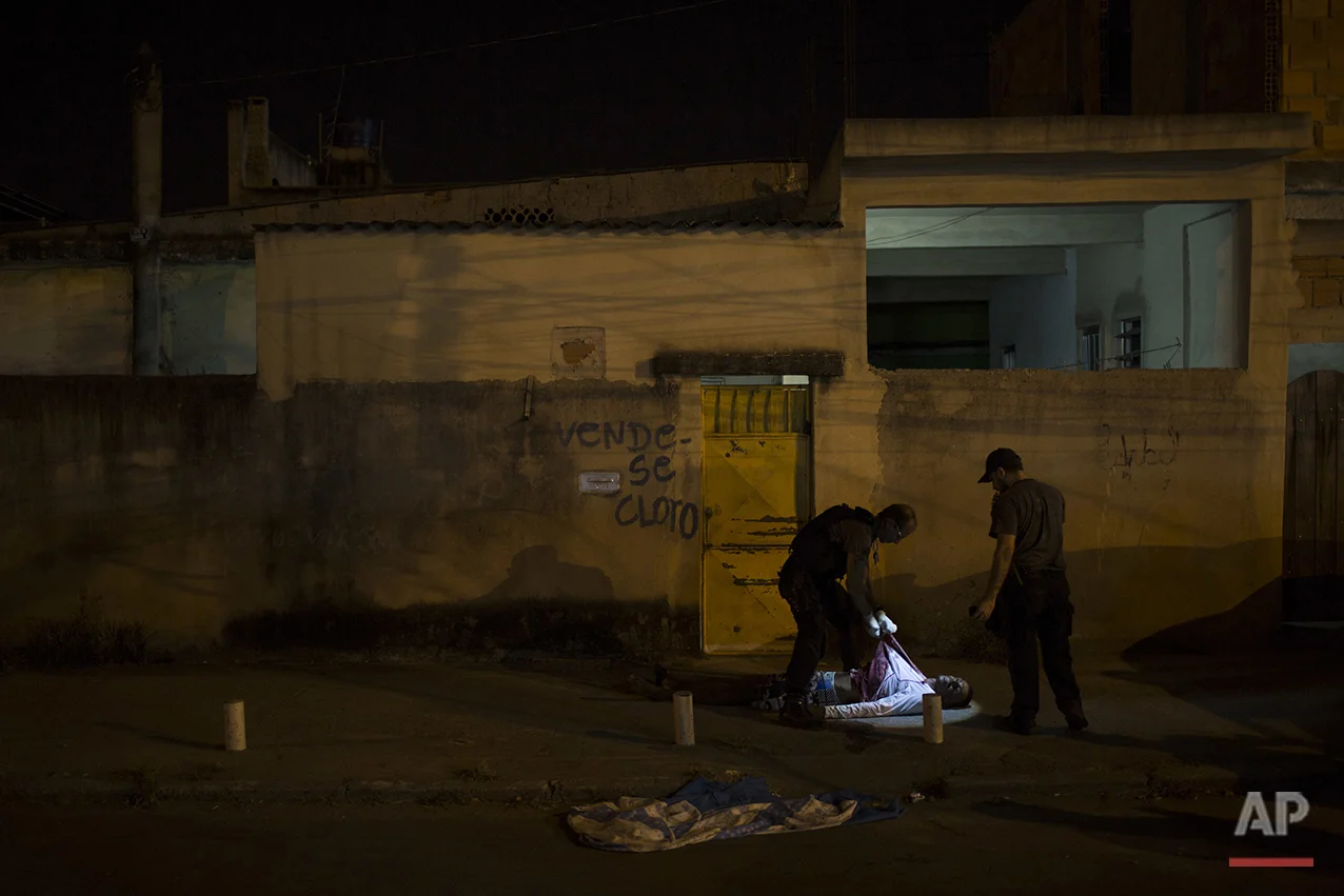 In this July 16, 2016 photo, police responding to a call find the body of a young black man in the middle of a residential street in Caxias, greater Rio de Janeiro, Brazil. Rio's ambitious security push to bring crime down and seize control of certain slums ahead of the 2016 Summer Games is crumbling. Overall slayings are on the rise in 2016, the victims overwhelmingly young, black men. (AP Photo/Felipe Dana)