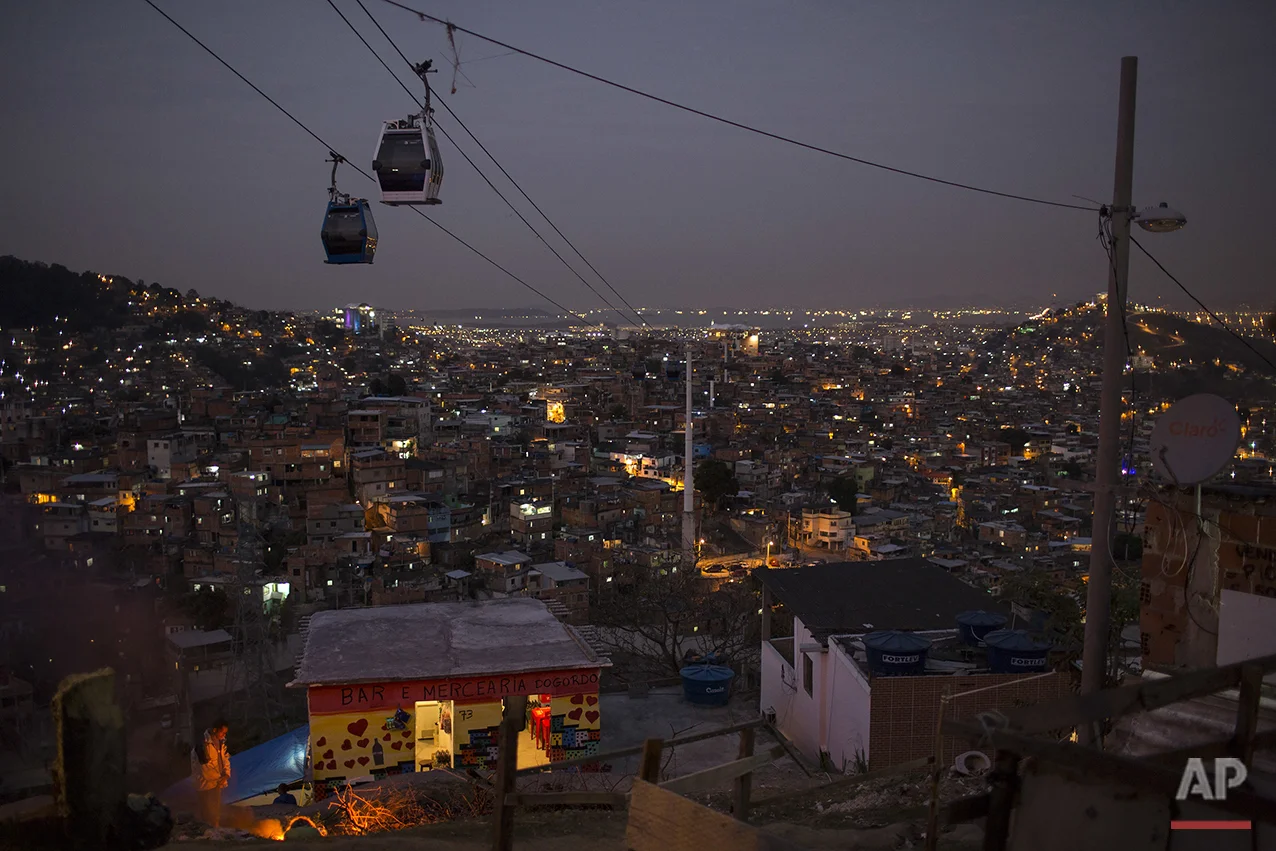 In this July 19, 2016 photo, cable cars transport commuters over the Complexo do Alemao, a sprawling cluster of slums in north Rio de Janeiro, Brazil. Just a short drive from upscale Rio districts like Ipanema and Copacabana, steep and narrow entryways lead to slums where poverty and gun violence dominate daily life for hundreds of thousands of residents.(AP Photo/Felipe Dana)