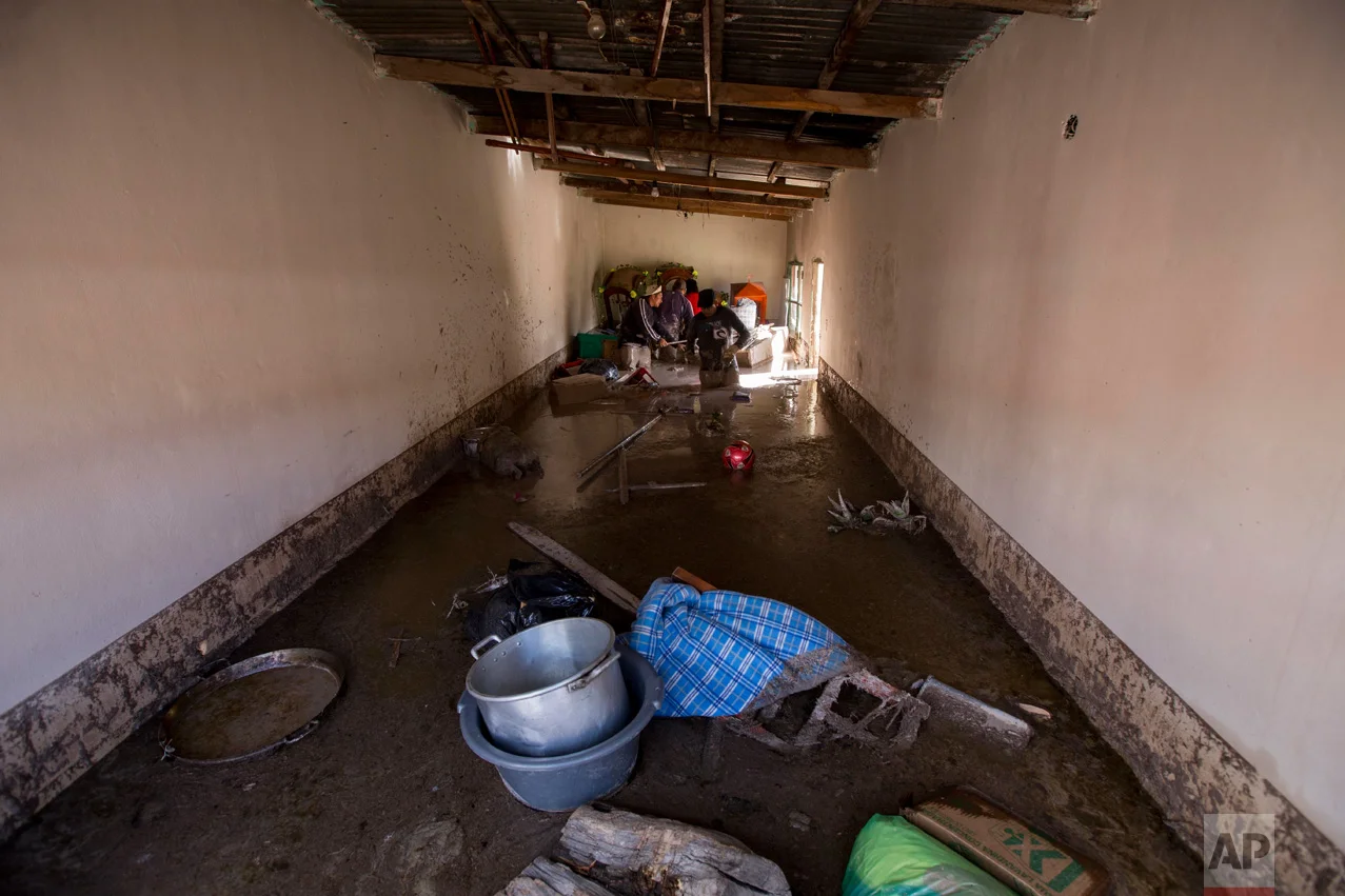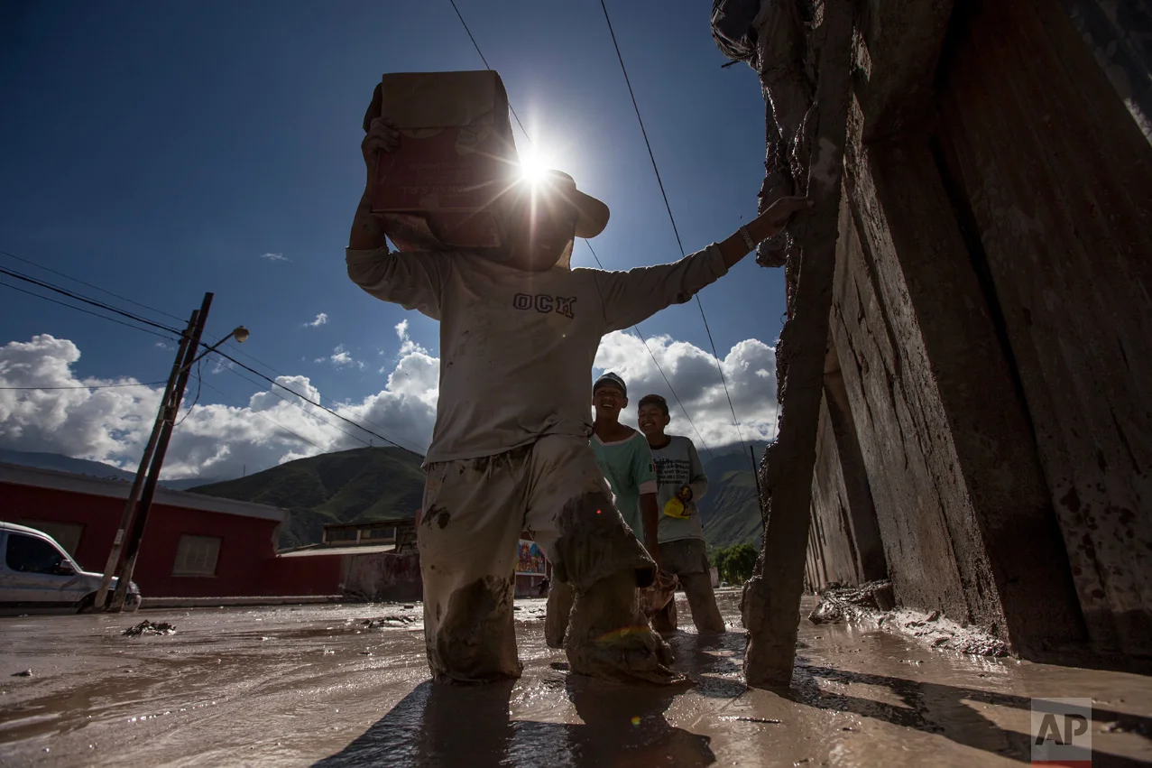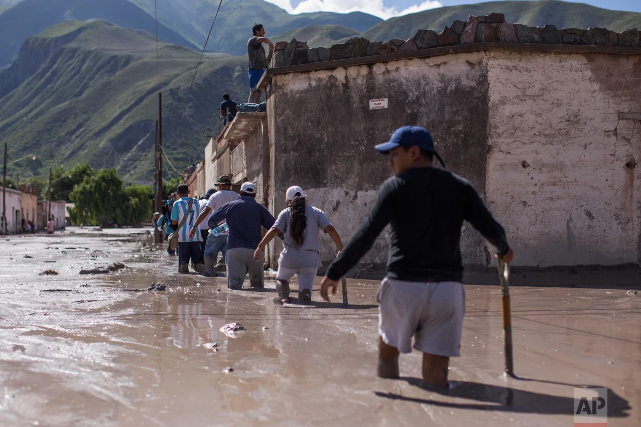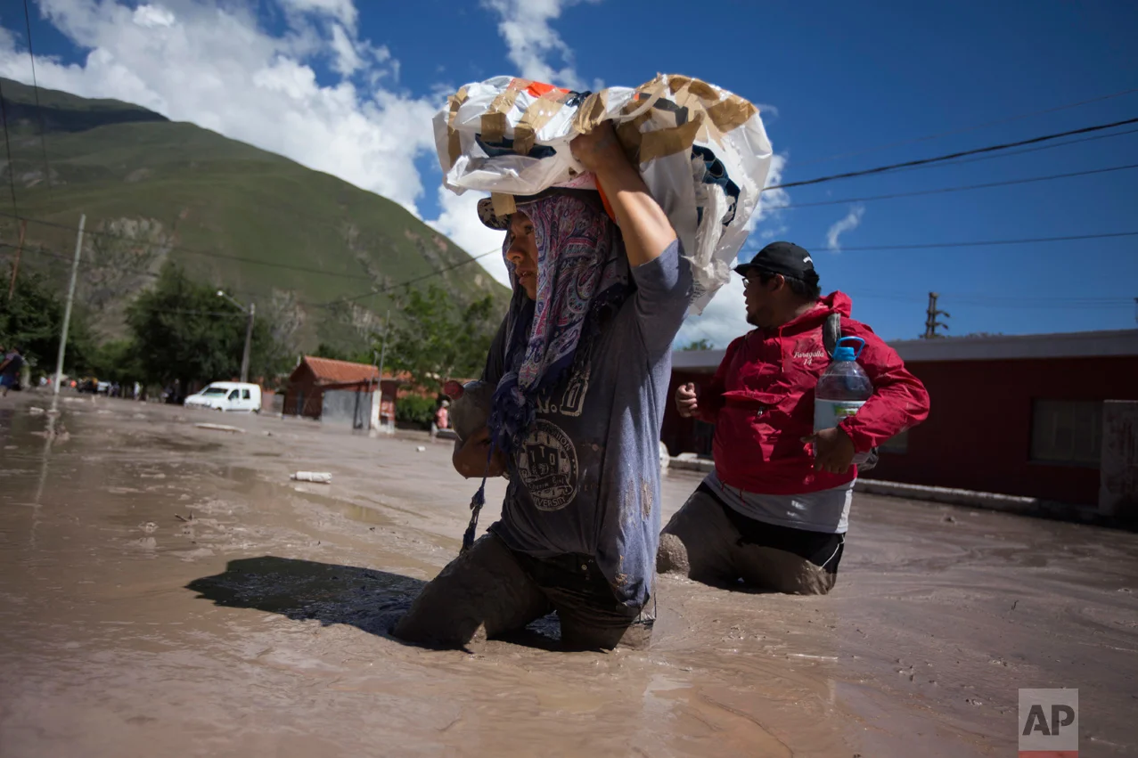 In this Jan. 13, 2017 photo, residents carry their belonging to the roofs of their mud flooded homes in the town of Volcan, Jujuy province, Argentina. Authorities declared the area a disaster zone after the town was hit by a mudslide one week ago, that covered it in a thick layer of mud. (Gianni Bulacio/Infoto via AP)
