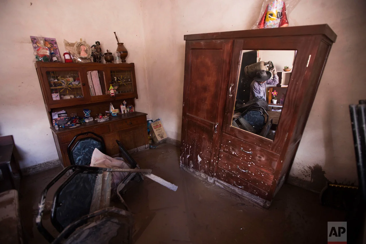 In this Jan. 13, 2017 photo, a resident begins the clean up of his mud flooded home in the town of Volcan, Jujuy province, Argentina. That town was covered by a mudslide a week ago after heavy rains hit the area. (Gianni Bulacio/Infoto via AP)