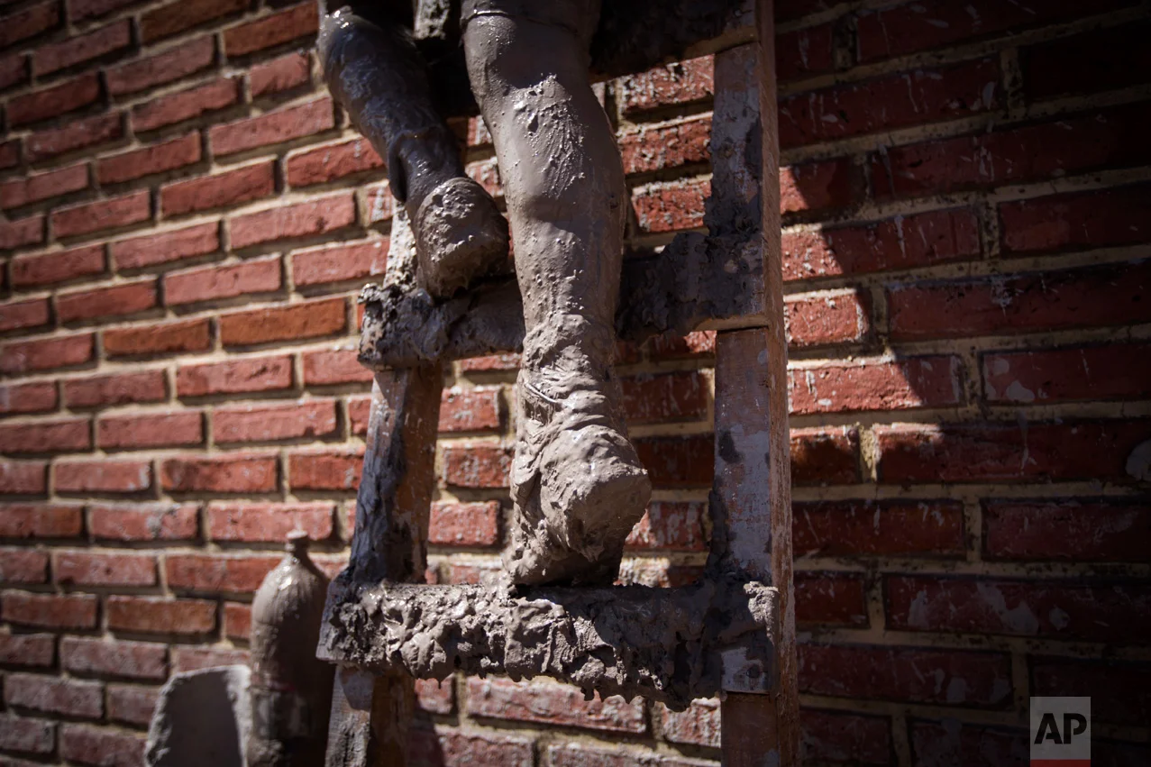 In this Jan. 13, 2017 photo, residents carry rescued religious figures through the mud covered streets of the town of Volcan, Jujuy province, Argentina. The statues will be taken to a secure place until cleanup efforts are completed in the mud covered town. (Gianni Bulacio/Infoto via AP)