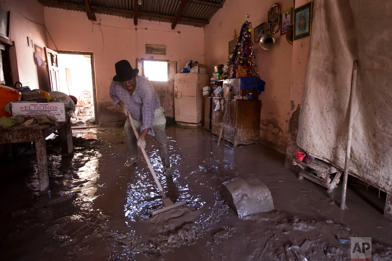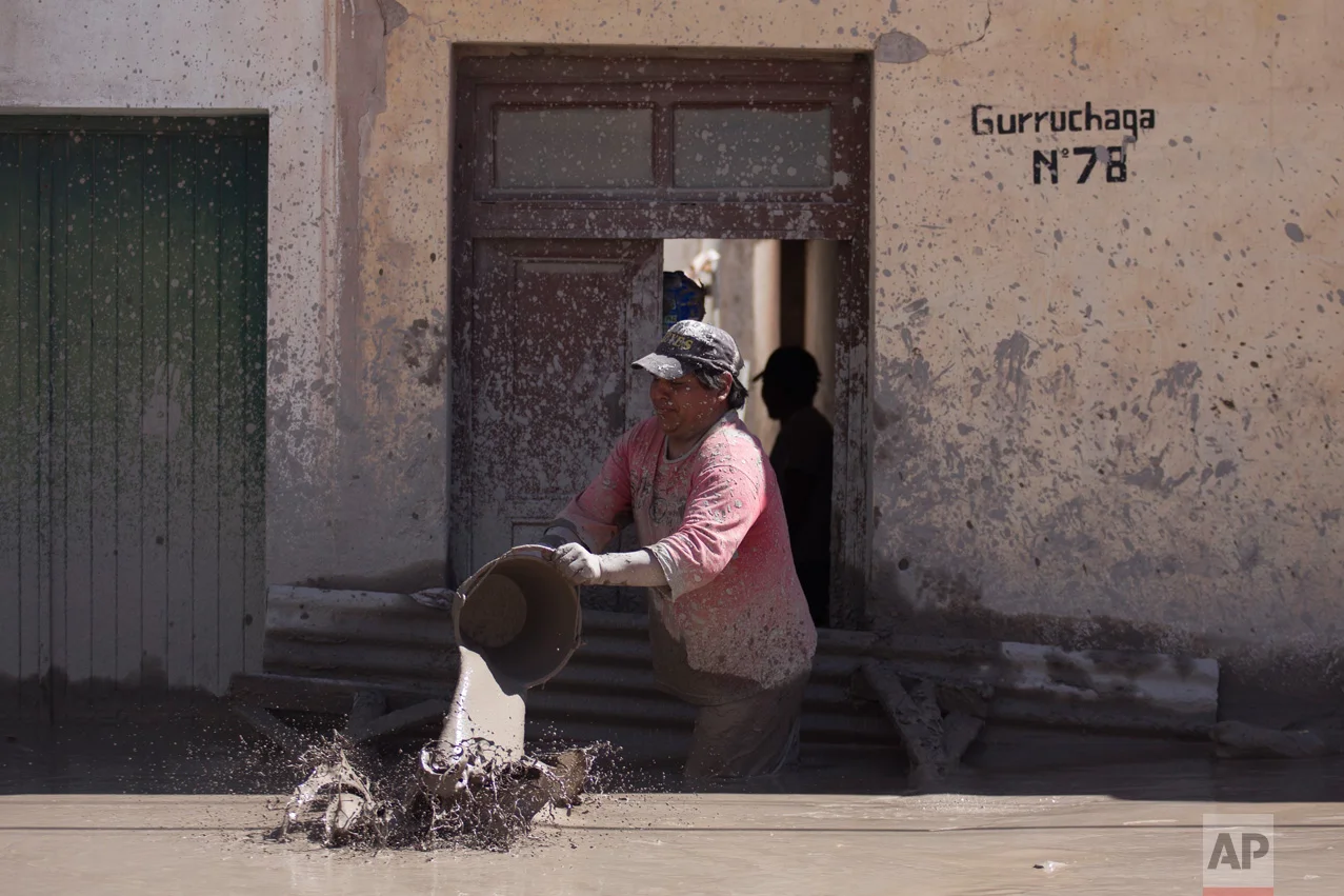 In this Jan. 13, 2017 photo, a resident begins the clean up of his mud damaged home in the town of Volcan, Jujuy province, Argentina. That town was hit by a mudslide a week ago after heavy rains blanketed the area. (Gianni Bulacio/Infoto via AP)
