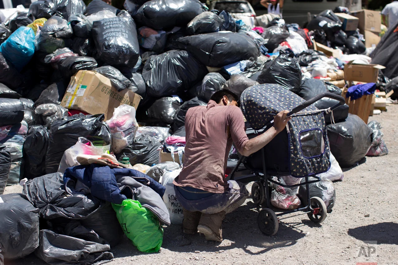 In this Jan. 13, 2017 photo, a resident looks at his son, next to a pile of bags full of donations in Volcan, Jujuy province, Argentina. The town was covered by a mudslide caused by the intense rains that hit the area one week ago, flooding it with mud, killing several and causing the evacuation of thousands. (Gianni Bulacio/Infoto via AP)