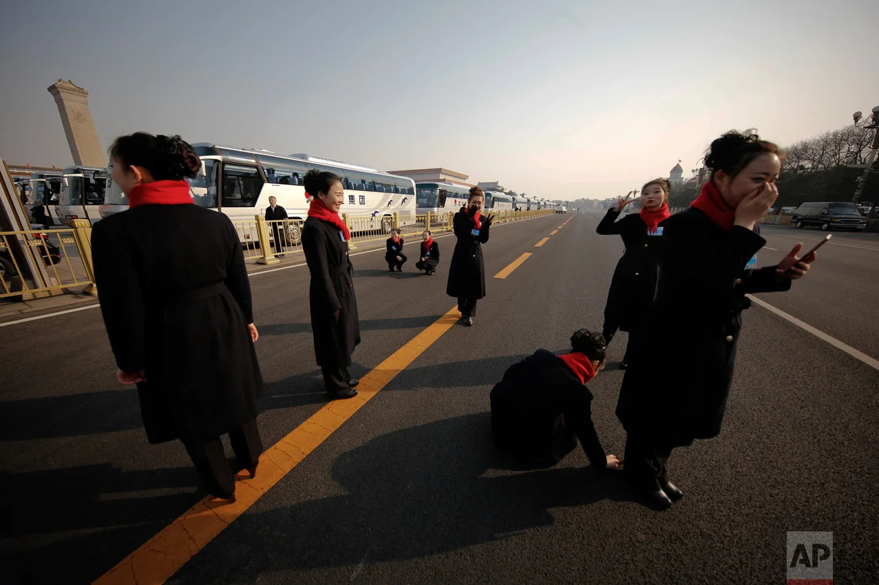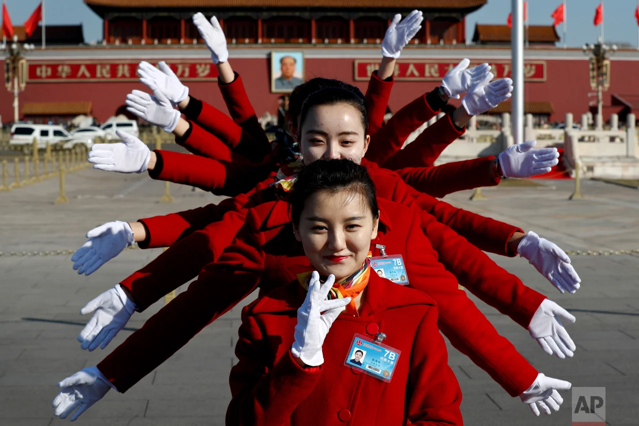 In this Sunday, March 5, 2017 photo, a hospitality staffer poses her colleagues for photographs on Tiananmen Square during the National People's Congress held at the Great Hall of the People in Beijing. (AP Photo/Andy Wong)