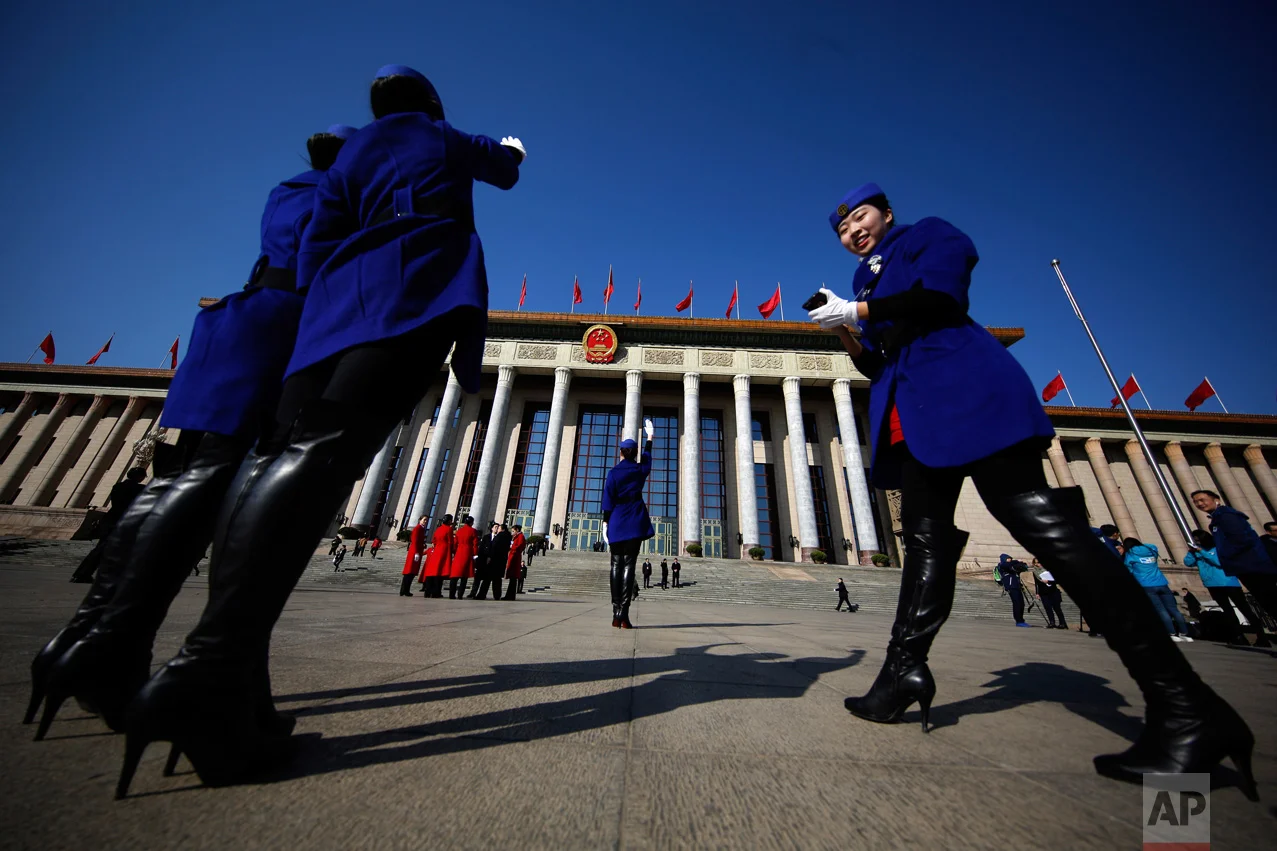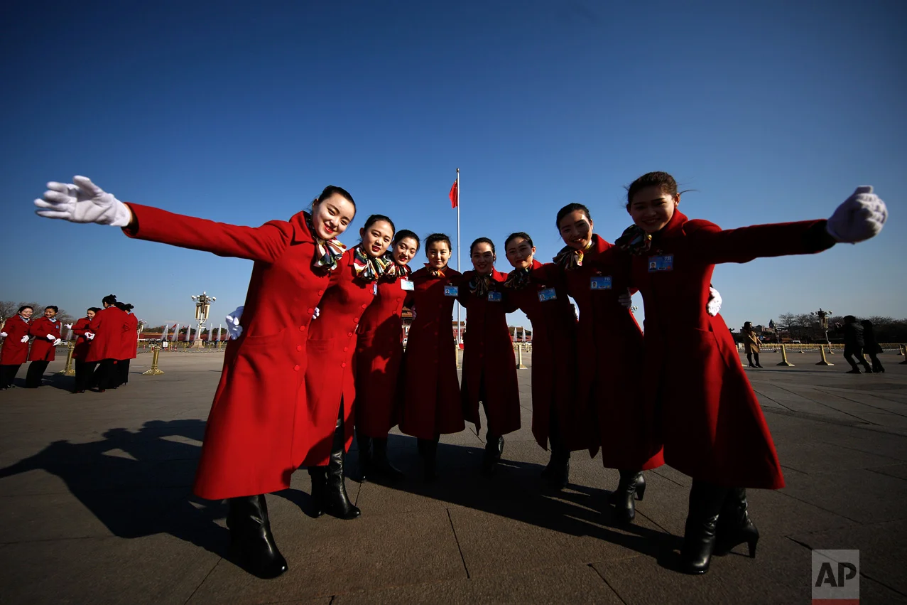 In this Sunday, March 5, 2017 photo, hospitality staff pose for photos on Tiananmen Square during the National People's Congress held at the Great Hall of the People in Beijing. (AP Photo/Andy Wong)