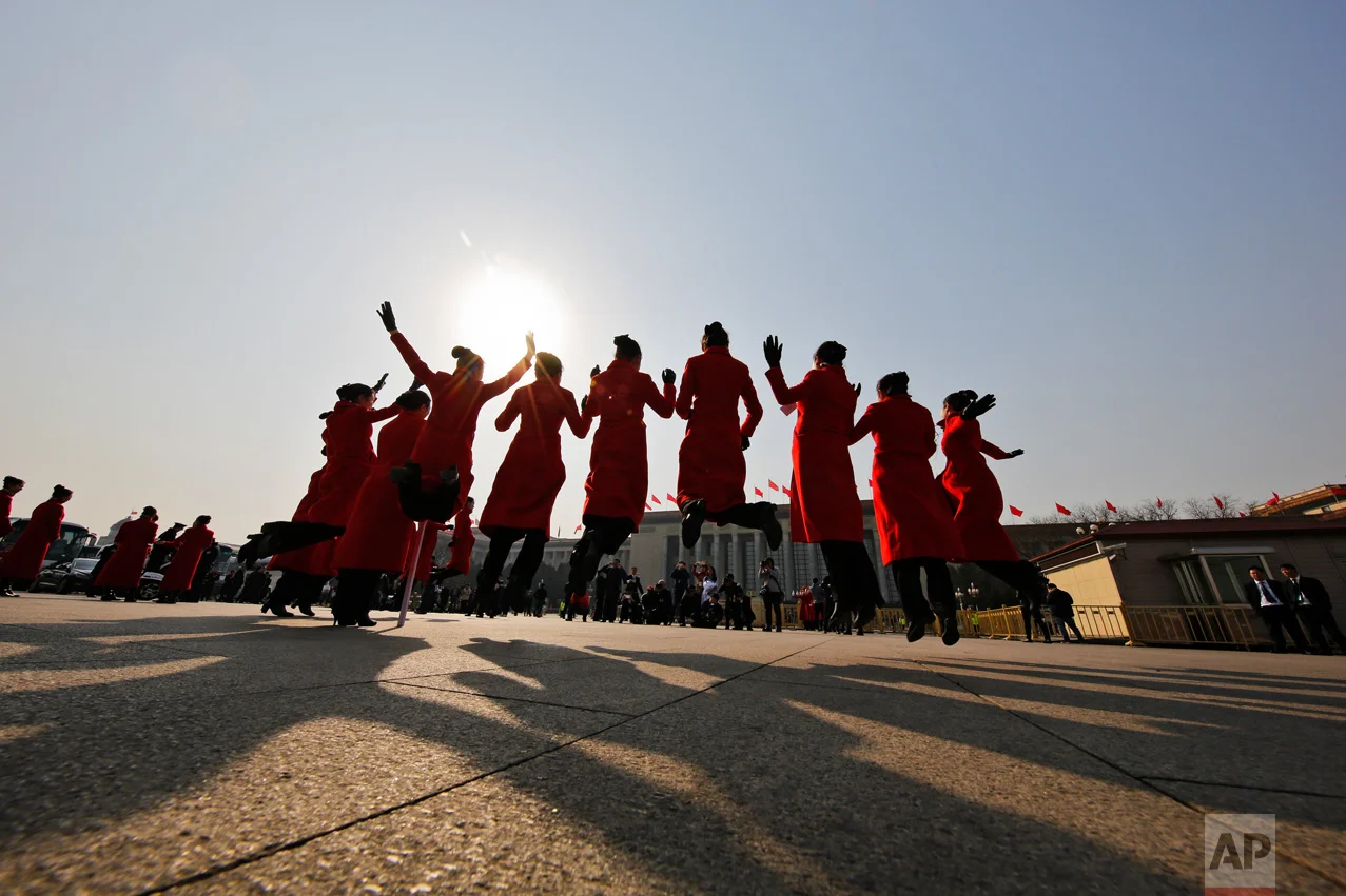 In this Sunday, March 5, 2017 photo, hospitality staff jump as they pose for photographs on Tiananmen Square during the National People's Congress held at the Great Hall of the People in Beijing. (AP Photo/Andy Wong)