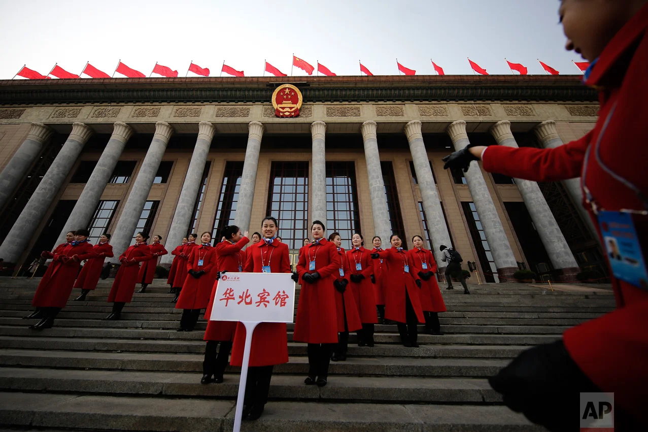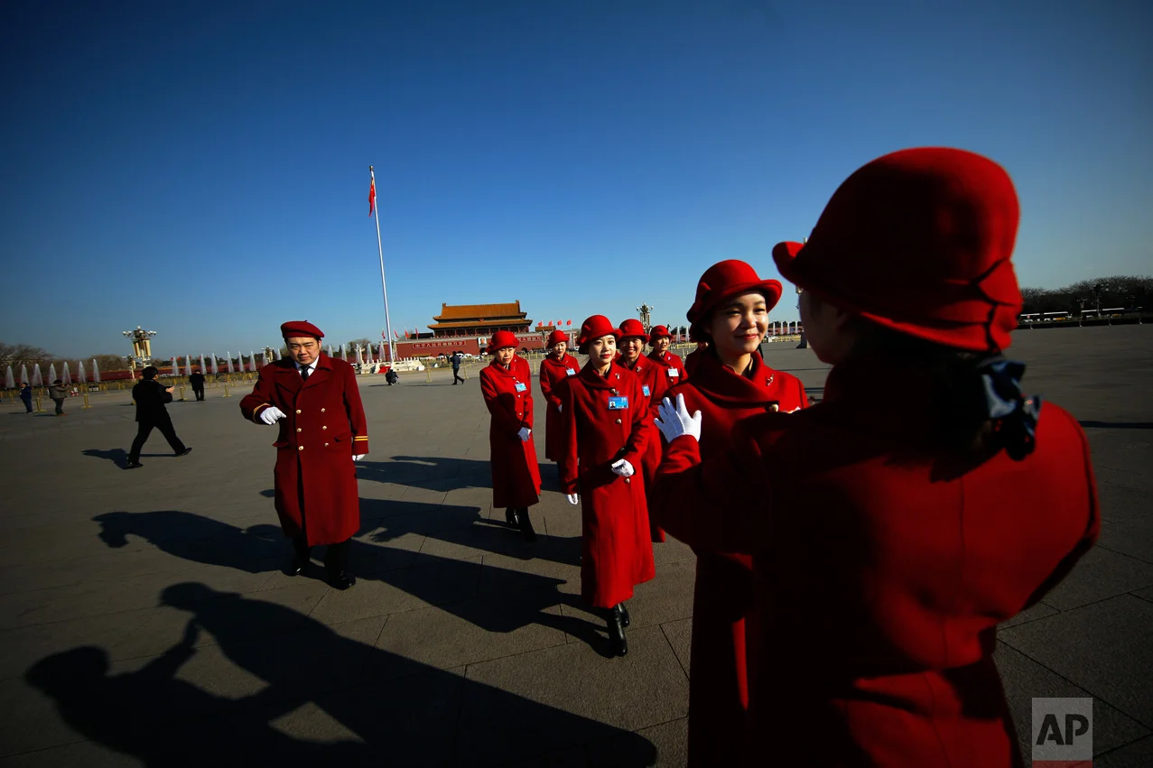 In this Friday, March 3, 2017 photo, a hospitality staffer directs her colleagues posing for photographs outside the Great Hall of the People during the Chinese People's Political Consultative Conference (CPPCC) in Beijing. (AP Photo/Andy Wong)