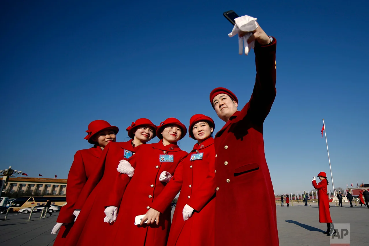 In this Sunday, March 5, 2017 photo, hospitality staff take selfies on Tiananmen Square during the National People's Congress held at the Great Hall of the People in Beijing. (AP Photo/Andy Wong)