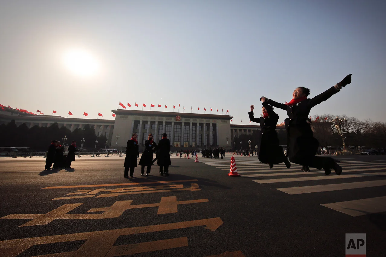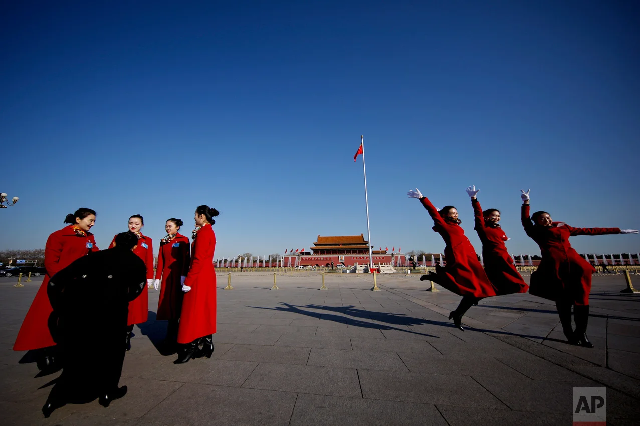 In this Friday, March 3, 2017 photo, hospitality staff jump as they pose for photographs on Tiananmen Square during the Chinese People's Political Consultative Conference (CPPCC) held at the Great Hall of the People in Beijing. (AP Photo/Andy Wong)