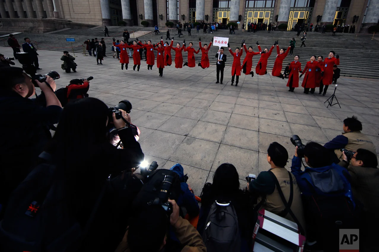 In this Friday, March 3, 2017 photo, hospitality staff jump as they pose for photographs in front of the Great Hall of the People during the Chinese People's Political Consultative Conference (CPPCC) in Beijing. (AP Photo/Andy Wong)