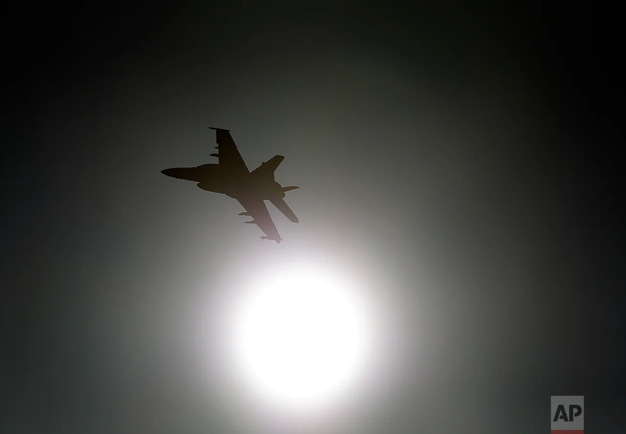 In this Feb. 28, 2017, photo, Thomas "Tom" P. McGee of the VX-9 Vampire squadron from Naval Air Weapons Station China Lake, flies an F/A-18E Super Hornet toward the sun over Death Valley National Park, Calif. Military jets roaring over national parks have long drawn complaints from hikers and campers. But in California's Death Valley, the low-flying combat aircraft skillfully zipping between the craggy landscape has become a popular attraction in the 3.3 million acre park in the Mojave Desert, 260 miles east of Los Angeles. (AP Photo/Ben Margot)