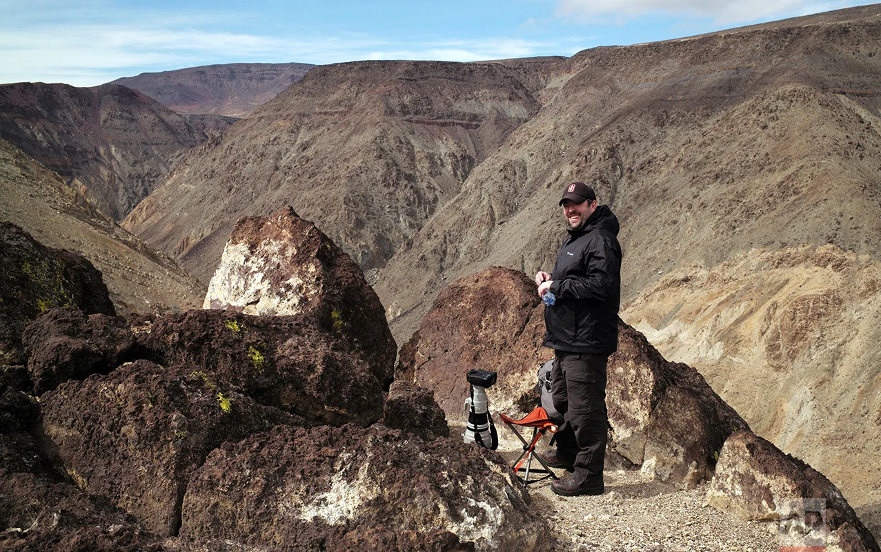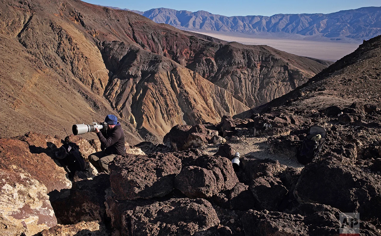 In this Feb. 28, 2017, photo, Jason O. Watson looks through a telephoto lens on a cliff overlooking the nicknamed Star Wars Canyon in Death Valley National Park, Calif. (AP Photo/Ben Margot)