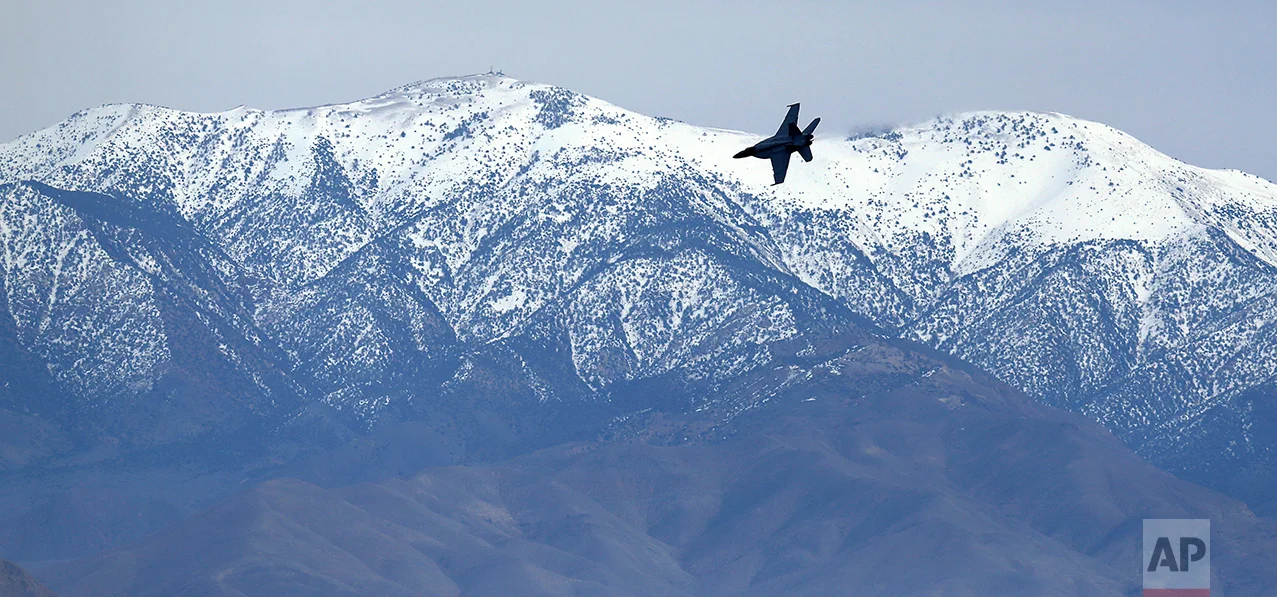 In this Feb. 27, 2017, photo an F-15E Strike Eagle from Seymour Johnson AFB in North Carolina flies out of the nicknamed Star Wars Canyon turning toward the Panamint range over Death Valley National Park, Calif. (AP Photo/Ben Margot)