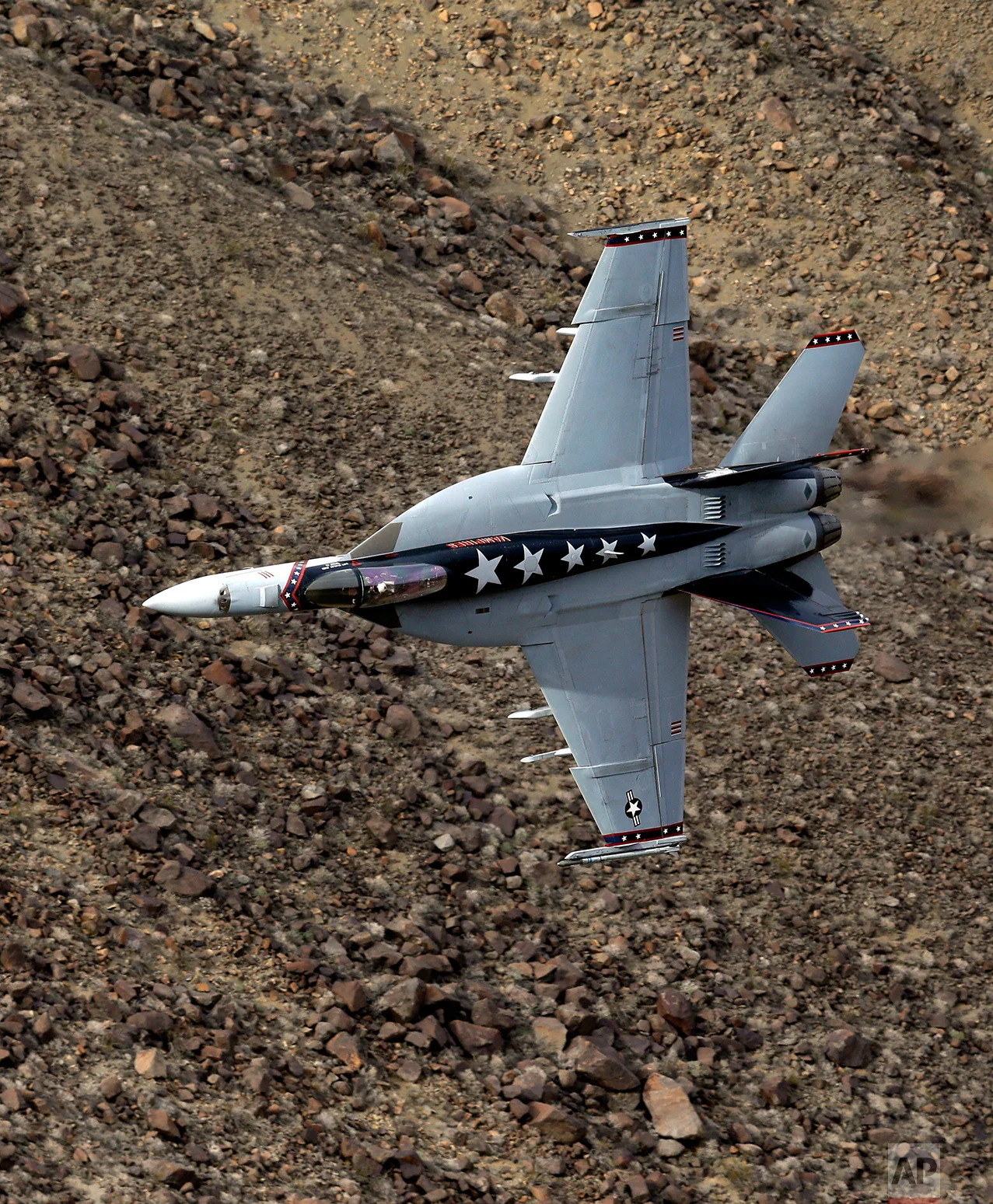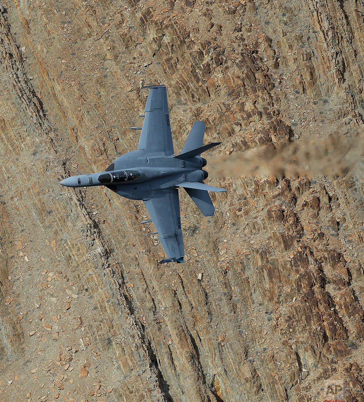 In this Feb. 27, 2017, photo, an F/A-18F Super Hornet from China Lake VX-9 Vampire squadron flies through the nicknamed Star Wars Canyon in Death Valley National Park, Calif. (AP Photo/Ben Margot)