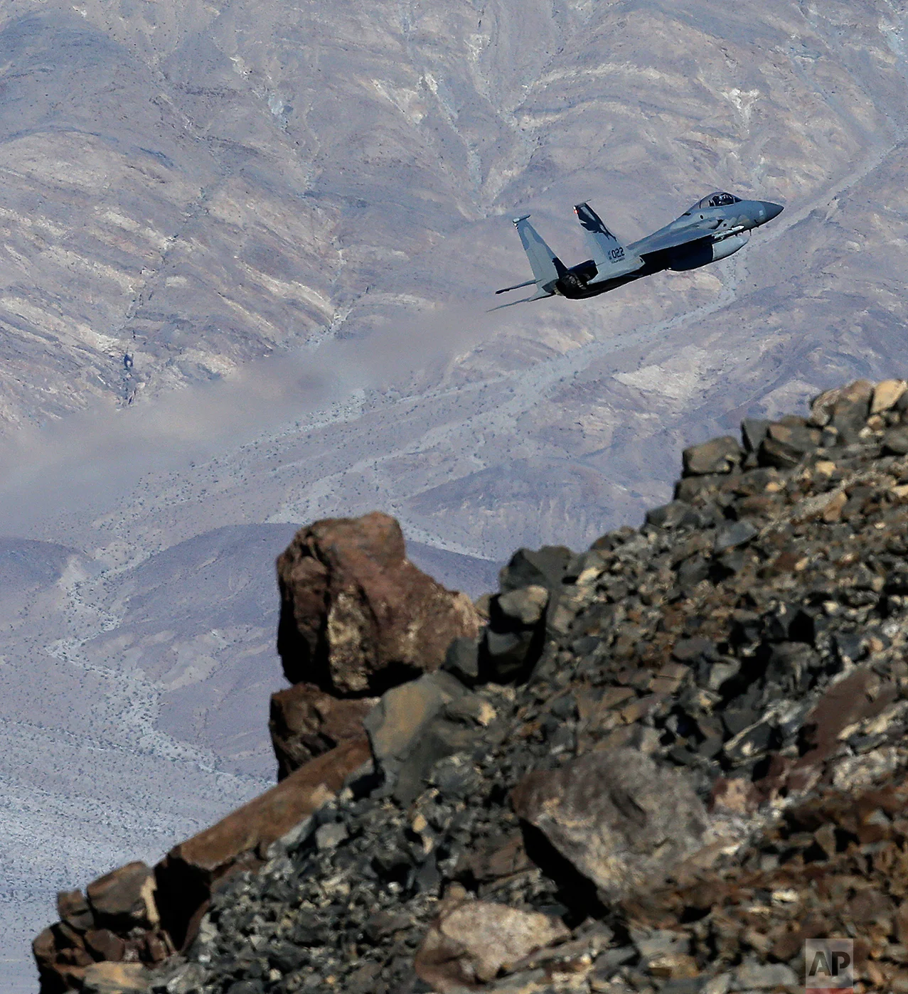 In this Feb. 28, 2017, photo, an F-15C Eagle from the California Air National Guard, 144th Fighter Wing, flies out of the nicknamed Star Wars Canyon over Death Valley National Park, Calif. (AP Photo/Ben Margot)