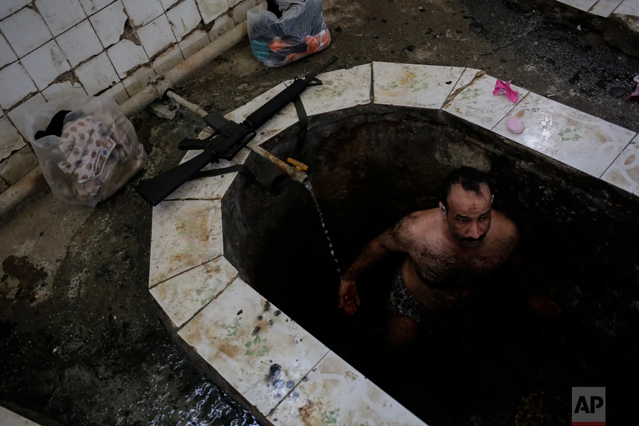 A federal police officer takes a bath in the Hamal Alil sulphur spa south of Mosul, Iraq, Thursday April, 27, 2017. The spa reopened several months ago after the town was liberated from the Islamic State group. Many Iraqi soldiers visit the spa, located half an hour south of Mosul, in between fighting against the Islamic State group for relaxation. (AP Photo/Bram Janssen)