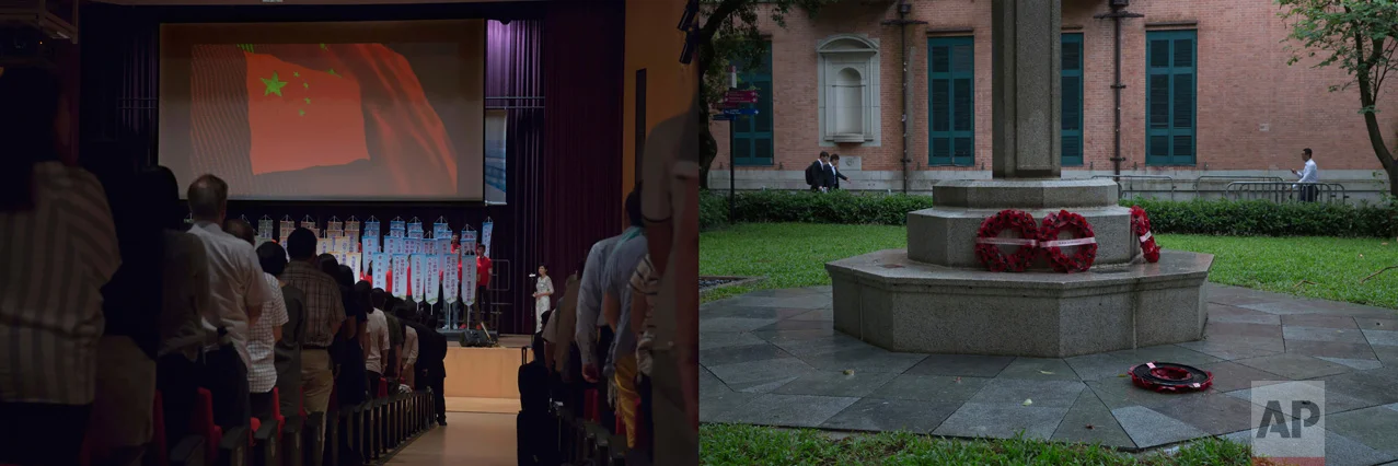 In this combination of photos, left: Participants stand for China's national anthem at a Hong Kong school meeting highlighting achievements of students who visited the mainland on exchange programs, Tuesday, June 6, 2017; and right: Wreaths mourning soldiers who died during first and second World Wars are placed outside St. John Cathedral in Hong Kong, Monday, June 12, 2017. (AP Photo/Kin Cheung)