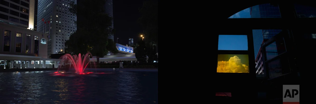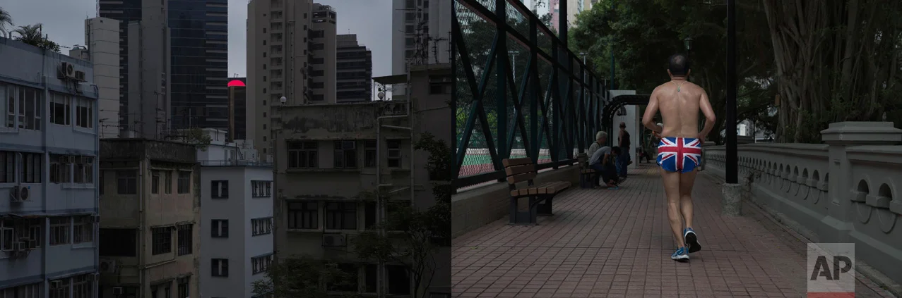 In this combination of photos, left: An LED screen seen between buildings emits a red glow in Hong Kong on Saturday, May 20, 2017; and right: A man wearing the British flag shorts jogs at King George V Memorial Park in Hong Kong on Friday, June 2, 2017. (AP Photo/Kin Cheung)
