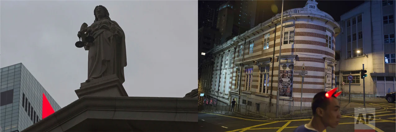 In this combination of photos, left: The corner of a red LED screen is seen next to the statue of the Goddess of Justice at the former Supreme Court in Hong Kong, Thursday, June 1, 2017; and right: A man wears devil horns in front of the Fringe Club, which was built in the colonial style, in Hong Kong, Saturday, May 27, 2017. (AP Photo/Kin Cheung)