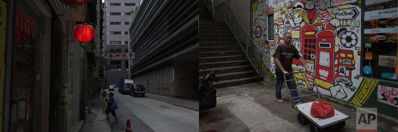 In this combination of photos taken on Friday, June 2 2017, left: A red lantern hangs outside a shop in Western District in Hong Kong; and right: A man pushes a trolley with a red plastic bag next to a wall depicting British themed graffiti art in Hong Kong. (AP Photo/Kin Cheung)