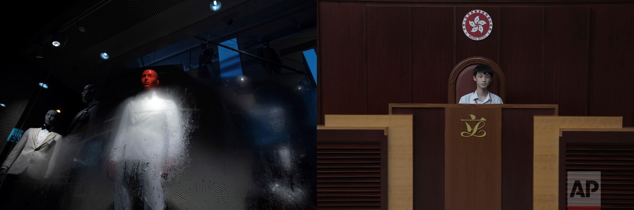 In this combination of photos, left: A mannequin with a red head is displayed at a fashion store in Hong Kong, Tuesday, June 20, 2017; and right: A student stands in a replica of the Hong Kong Legislative Council, Wednesday, June 21, 2017. (AP Photo/Kin Cheung)