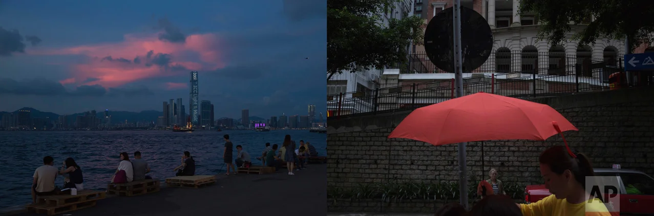 In this combination of photos, left: Residents look at the sunset glow over Victoria Harbor in Hong Kong, Sunday, June 11, 2017; and right: A woman carries a red umbrella past Sun Yat-sen Museum, which was built in the colonial style, Saturday, May 20, 2017. (AP Photo/Kin Cheung)