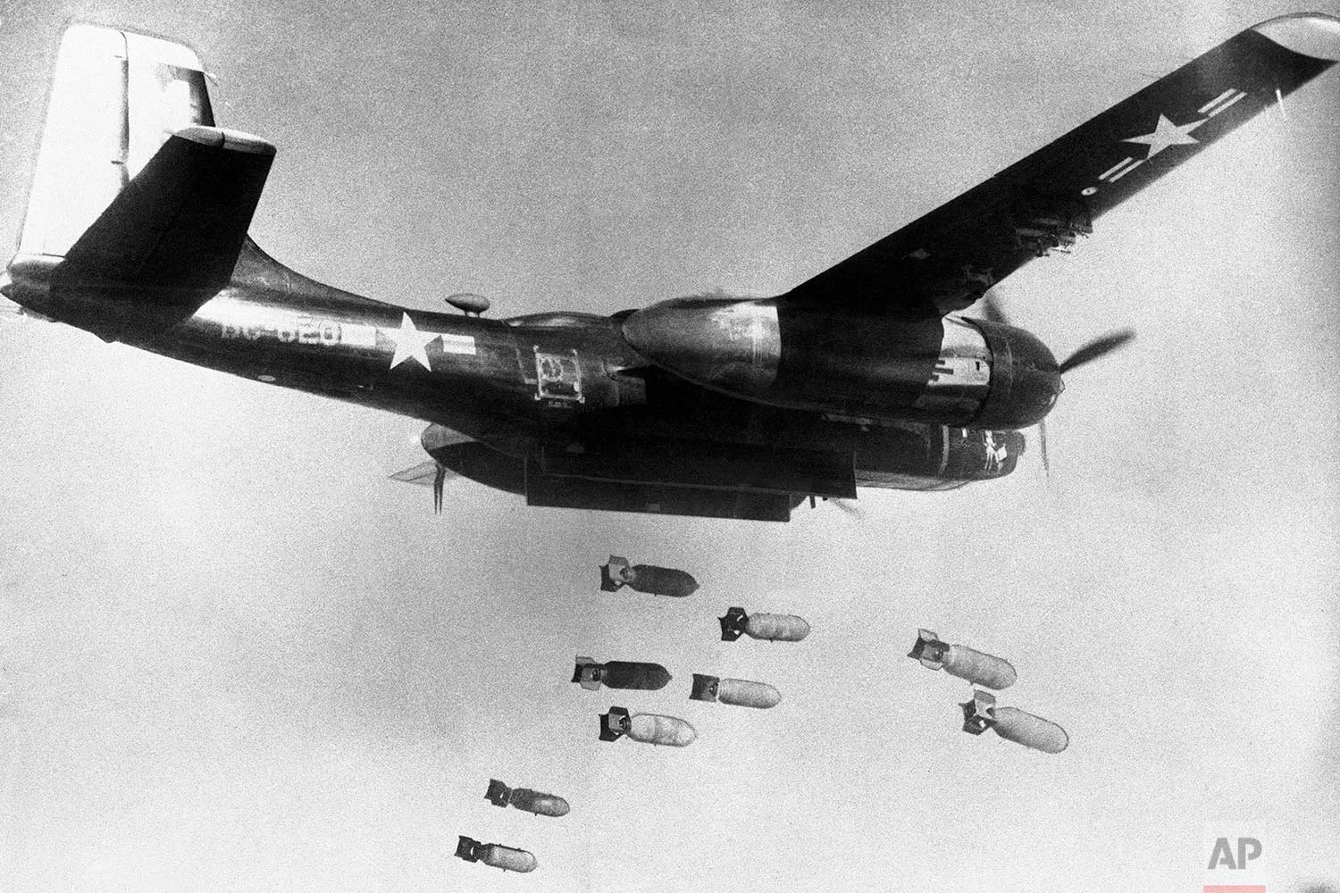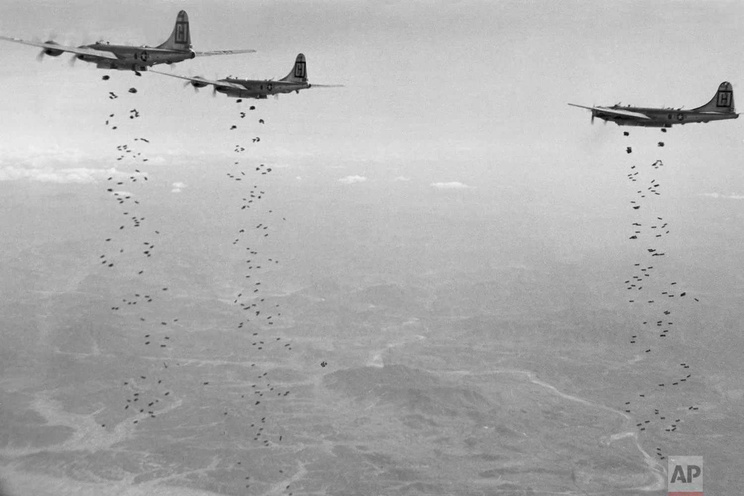 In this Jan. 18, 1951, file photo, Bomber Command planes of the U.S. Far East Air Forces rain tons of high demolition bombs in North Korea. (U.S. Air Force via AP)