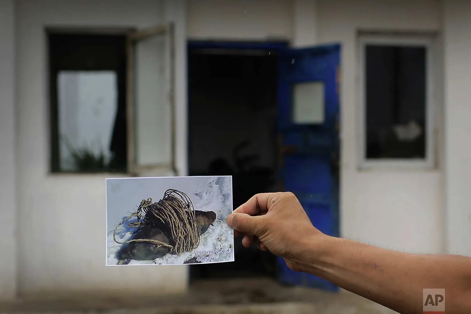 In this Friday, July 21, 2017, photo, Maj. Jong Il Hyon, 44, a member of a bomb squad for South Hamgyong, holds up a photograph in Hamju county, North Korea, of an unexploded bomb found near the railway which runs through Hamhung from Pyongyang to the northeastern port of Chongjin. (AP Photo/Wong Maye-E)