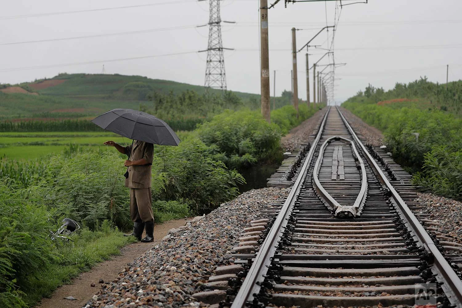 In this Friday, July 21, 2017, photo, a man stands near the pathway leading to where an unexploded bomb was found near the railway which runs through Hamhung from Pyongyang to the northeastern port of Chongjin. (AP Photo/Wong Maye-E)