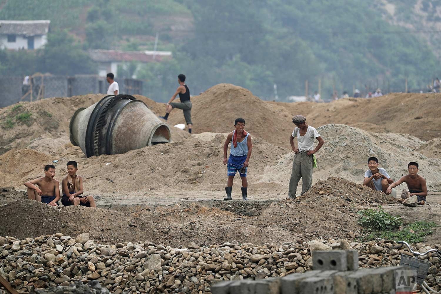 In this Friday, July 21, 2017, photo, men and boys rest at a construction site on the outskirts of Hamhung, North Korea's second-largest city, where construction workers unearthed a rusted but still potentially deadly mortar round in February. (AP Photo/Wong Maye-E)