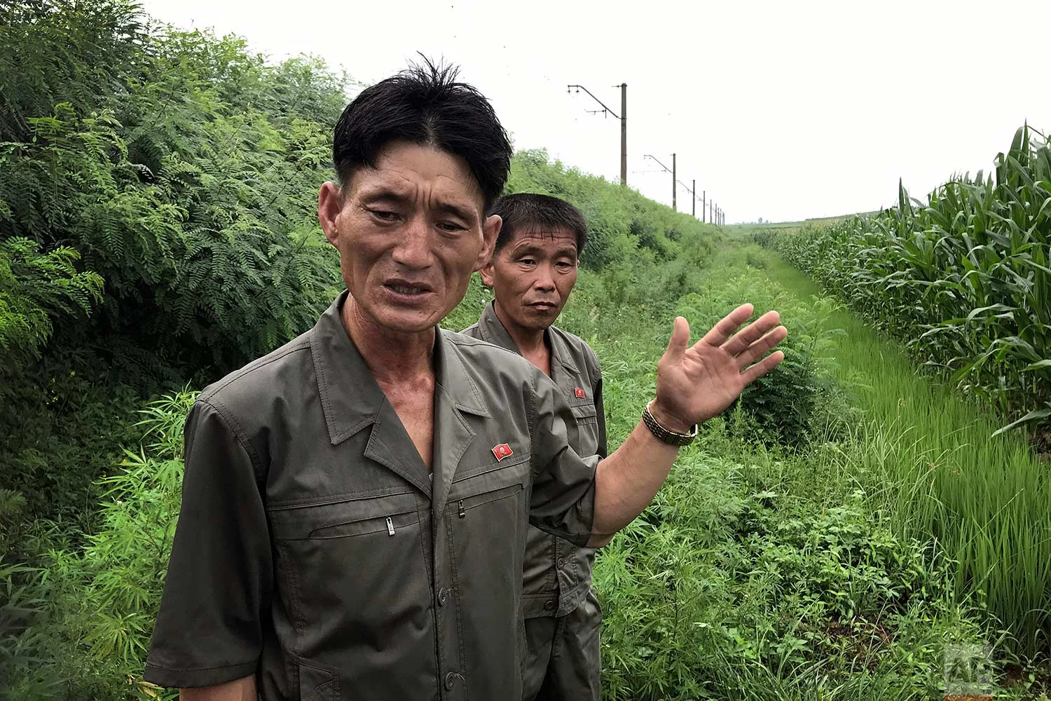 In this Friday, July 21, 2017, photo, Yom Hak Chol, 44, manager of the 4th work team of the Pohang cooperative farm, left, and Paek Song Guk, 44, who found an unexploded bomb near the railway which runs through Hamhung from Pyongyang to the northeastern port of Chongjin, speak to The Associated Press in Hamju county, North Korea. (AP Photo/Wong Maye-E)