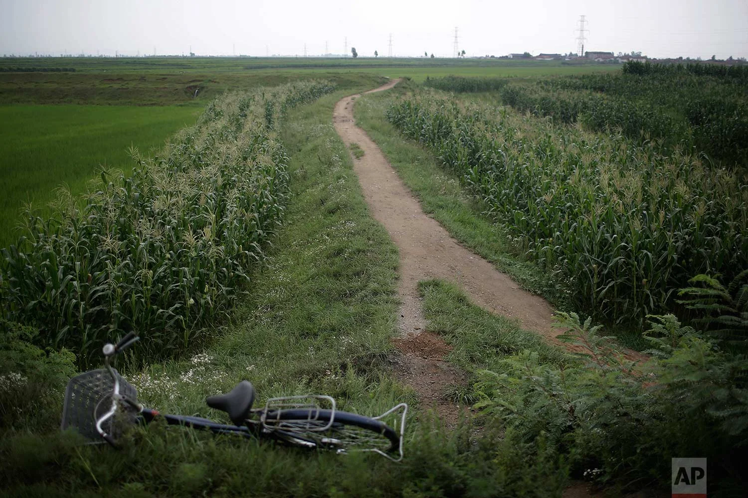 In this Friday, July 21, 2017, photo, a bicycle lies near a pathway in Hamju county, North Korea, leading to where an unexploded bomb was found near the railway which runs through Hamhung from Pyongyang to the northeastern port of Chongjin. (AP Photo/Wong Maye-E)
