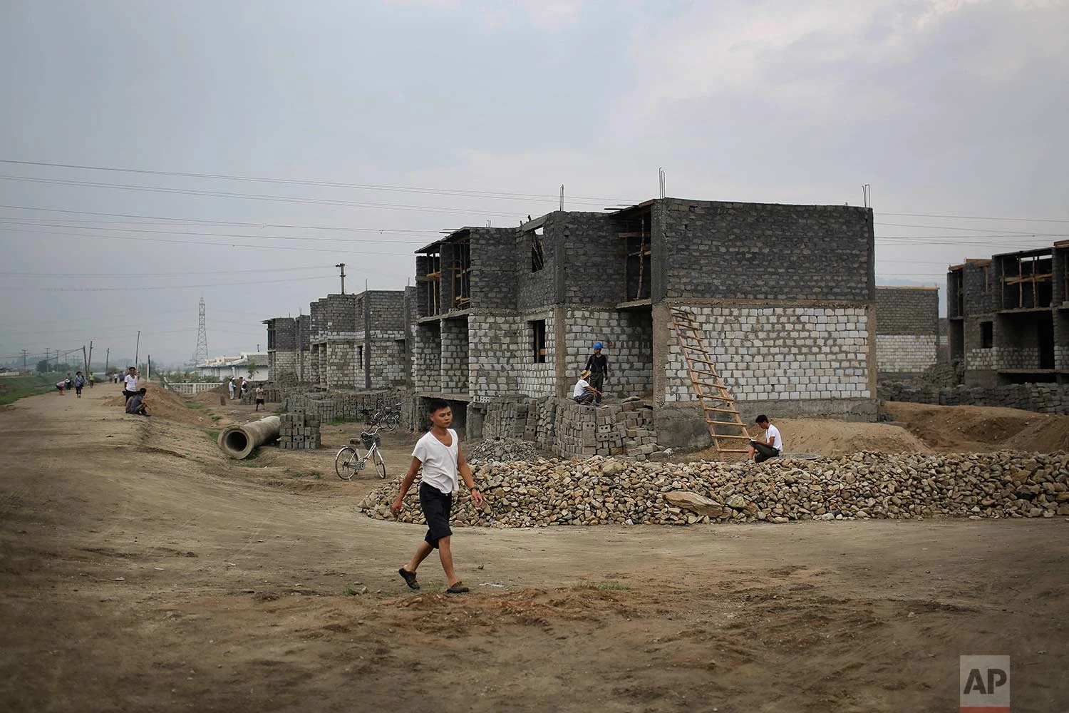 In this Friday, July 21, 2017, photo, a man walks past a construction site on the outskirts of Hamhung, North Korea's second-largest city, where construction workers unearthed a rusted but still potentially deadly mortar round in February. North Korea is just one of many countries still dealing with the explosive legacy of major wars. But the three-year Korean War, which ended in what was supposed to be a temporary armistice on July 27, 1953, was one of the most brutal ever fought. (AP Photo/Wong Maye-E)