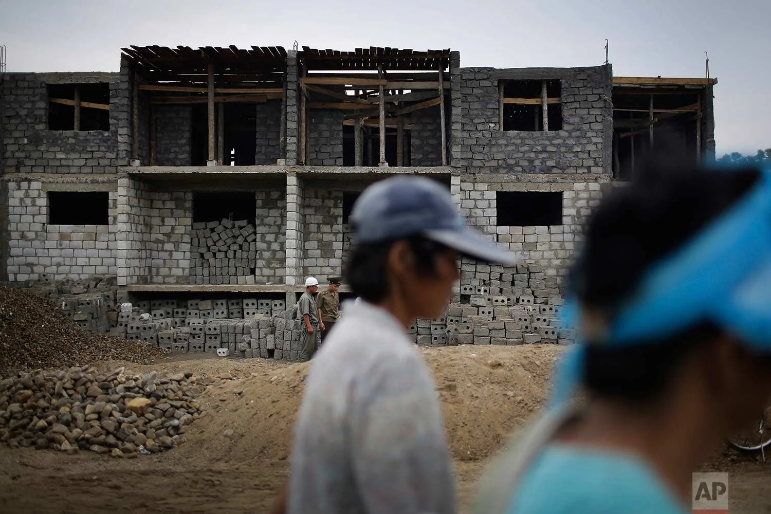 In this Friday, July 21, 2017, photo, women walk past a construction site on the outskirts of Hamhung, North Korea's second-largest city, where construction workers unearthed a rusted but still potentially deadly mortar round in February. (AP Photo/Wong Maye-E)