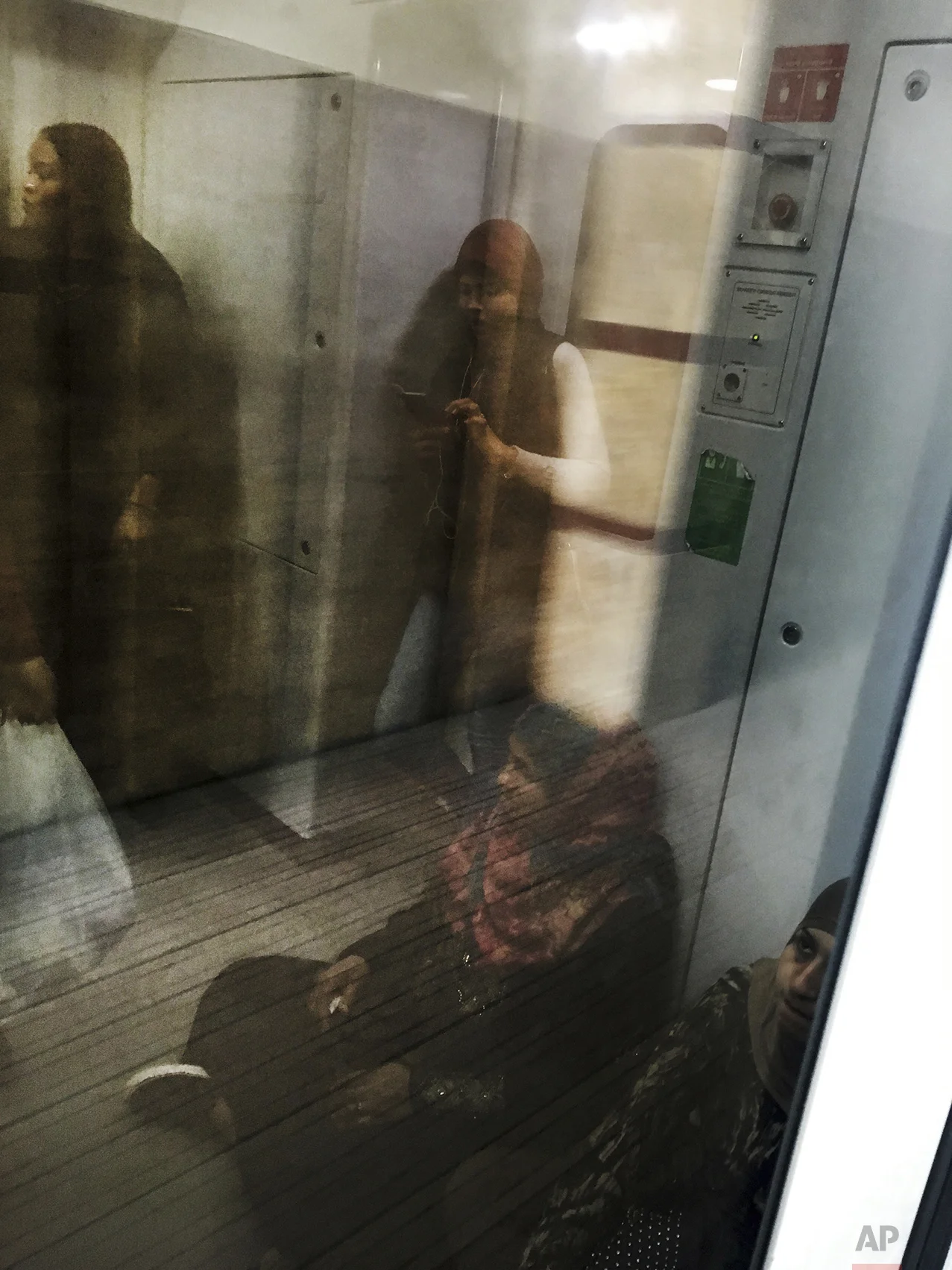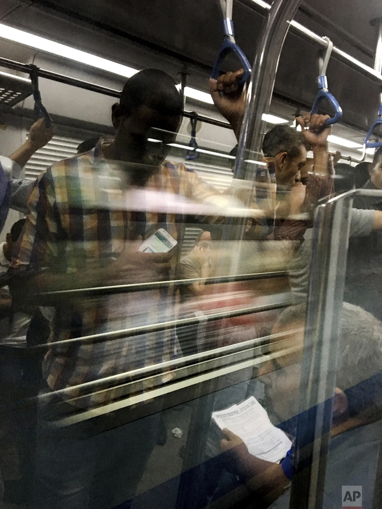 In this May 16, 2017 photo, commuters reflected in glass ride a metro car, in Cairo, Egypt. (AP Photo/Nariman El-Mofty)